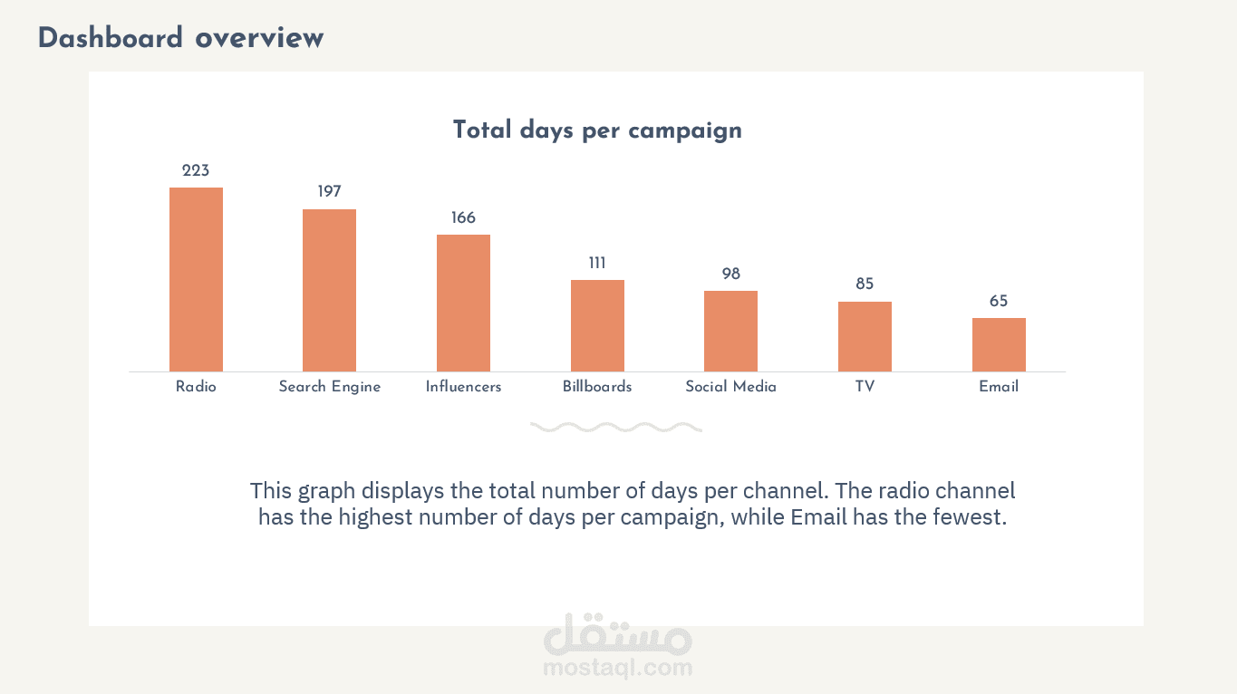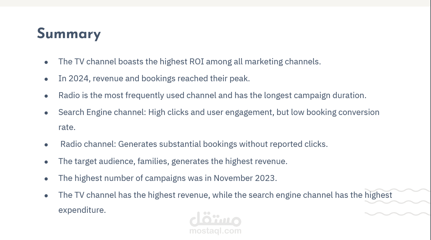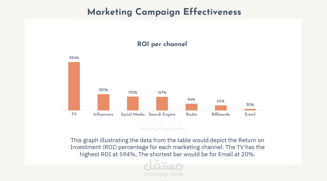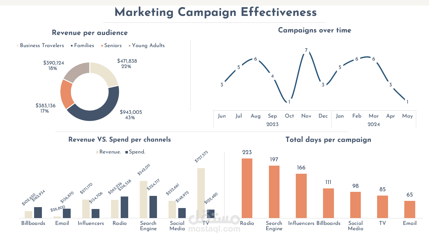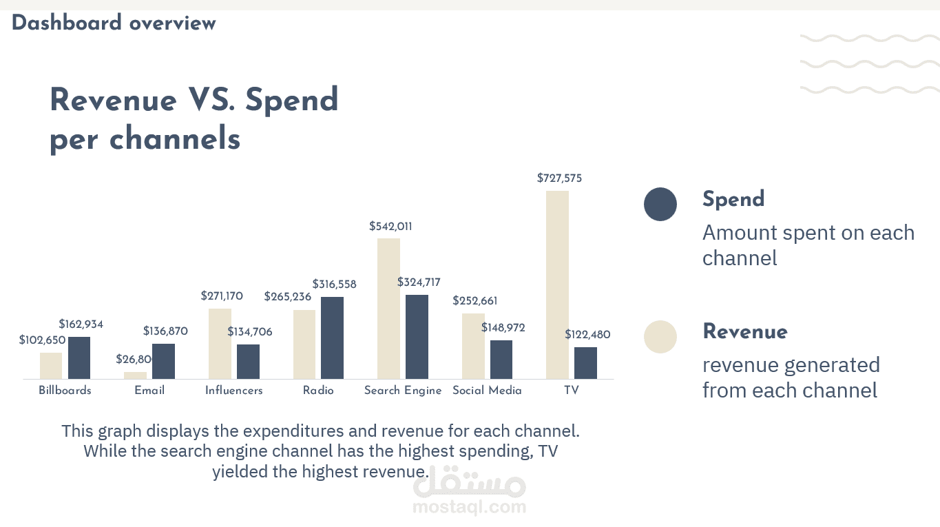 -Revenue vs. Expenditure: TV leads revenue, search engine highest spend.