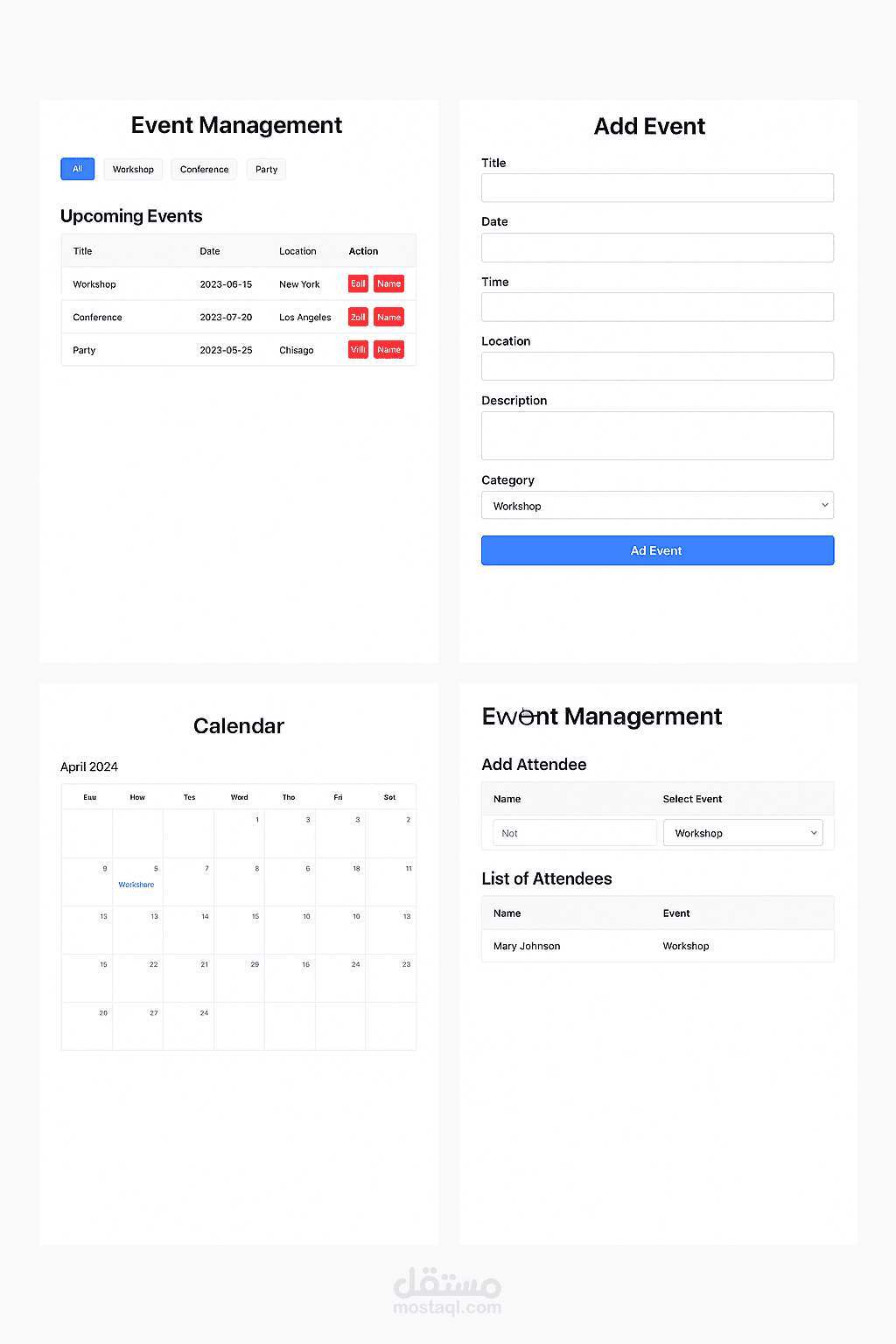 يتيح التطبيق للمستخدمين إمكانية إضافة وتعديل الفعاليات، إدارة الحضور، وعرض الفعاليات حسب الفئة أو على شكل تقويم.