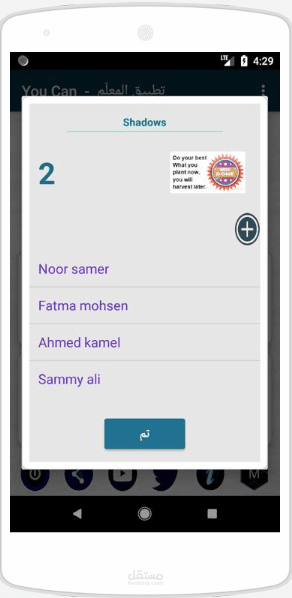 تطبيق موجه للمُعلمين وأعضاء هيئة التدريس لتسهيل إدارة طلابهم فى المراحل المختلفة والوقوف على مستوى كل مجموعة , يوفر التطبيق نظام حسابات قوى يمكن المعلم من إستعراض بياناته وبيانات طلابه من أى مكان أو هاتف , من خلال التطبيق يمكن إنشاء وتعديل عدد غير محدود من الفصول , إنشاء وتعديل عدد غير محدود من المجموعات الطلابية فى كل فصل مع إدارة بيانات الطلاب فى كل مجموعة .