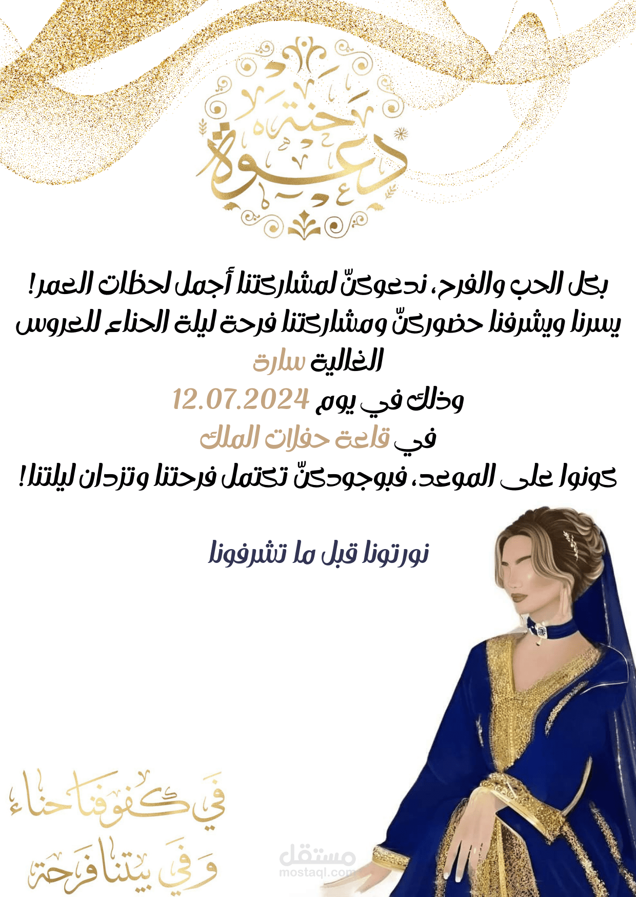 بطاقة دعوة حنّة بتصميم أنيق يحمل طابعًا شرقيًا بلمسة عصرية، باللون الأزرق الملكي الذي يرمز للصفاء والرقي. زُيّنت بزخارف ناعمة وتفاصيل ذهبية تضيف فخامة خاصة، مع تنسيق متوازن بين الخط العربي الكلاسيكي والخط العصري. تصميم يعكس أجواء الفرح والأنوثة، ويُعبّر عن ليلة لا تُنسى بكل تفاصيلها