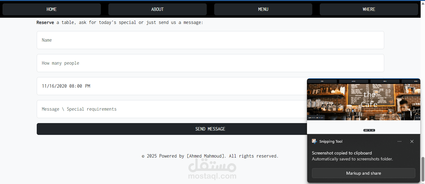Reservation Form with inputs for name, number of people, date/time, and message