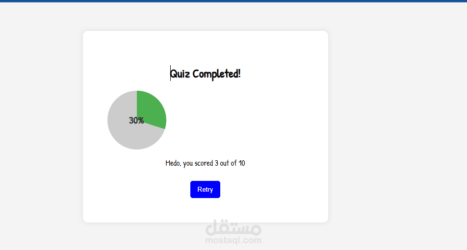 I developed an interactive Quiz Web App using pure JavaScript, HTML, and CSS. The application allows users to enter their name, answer a series of randomized multiple-choice questions, and view a visual summary of their performance at the end.