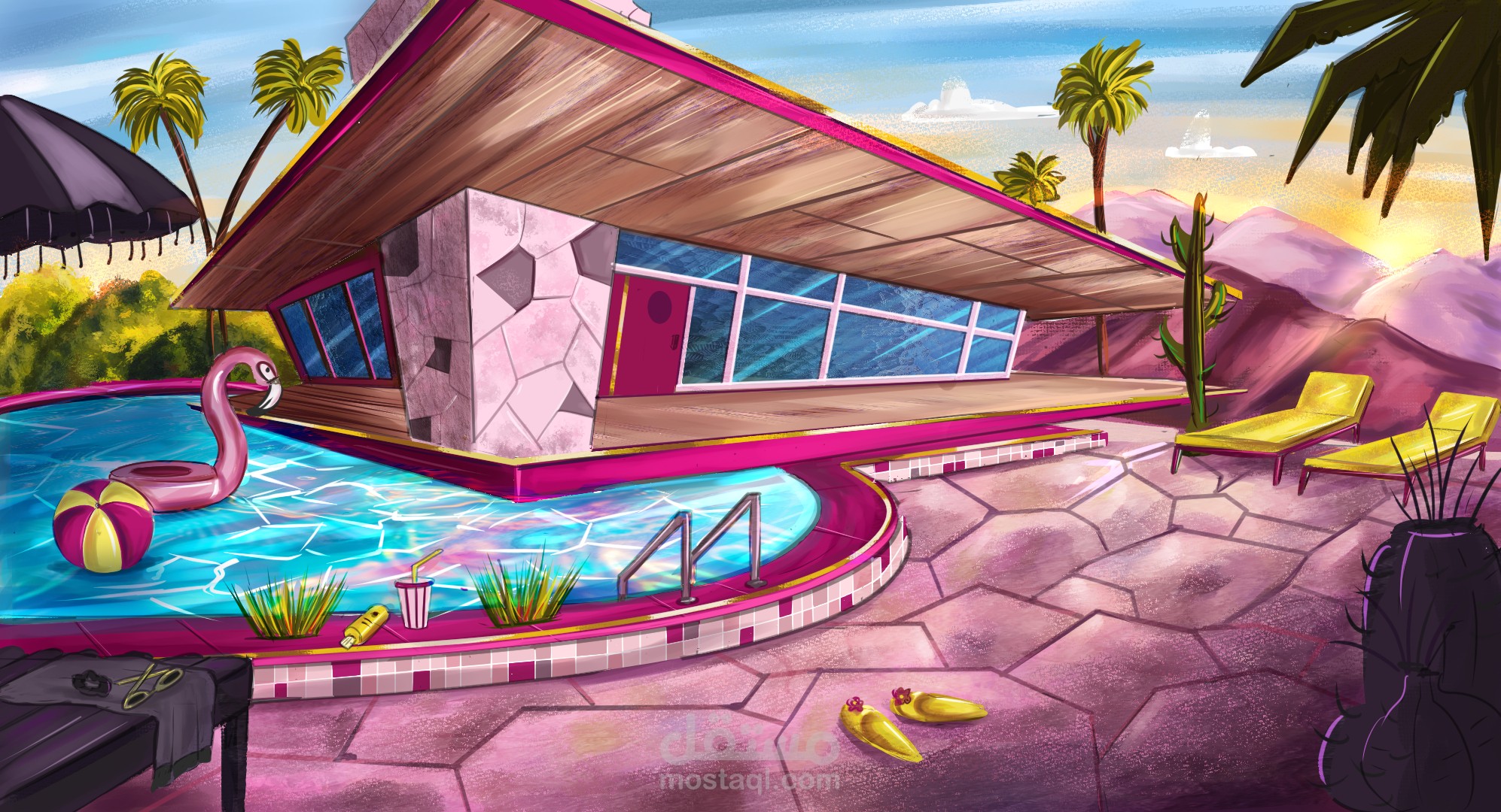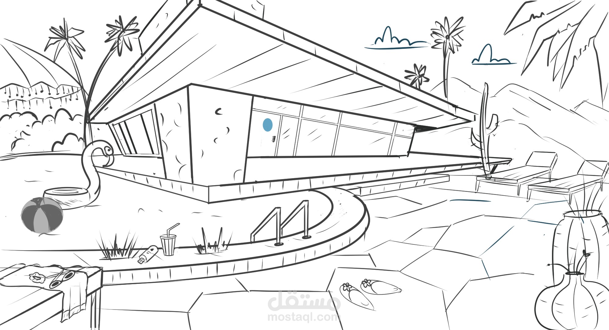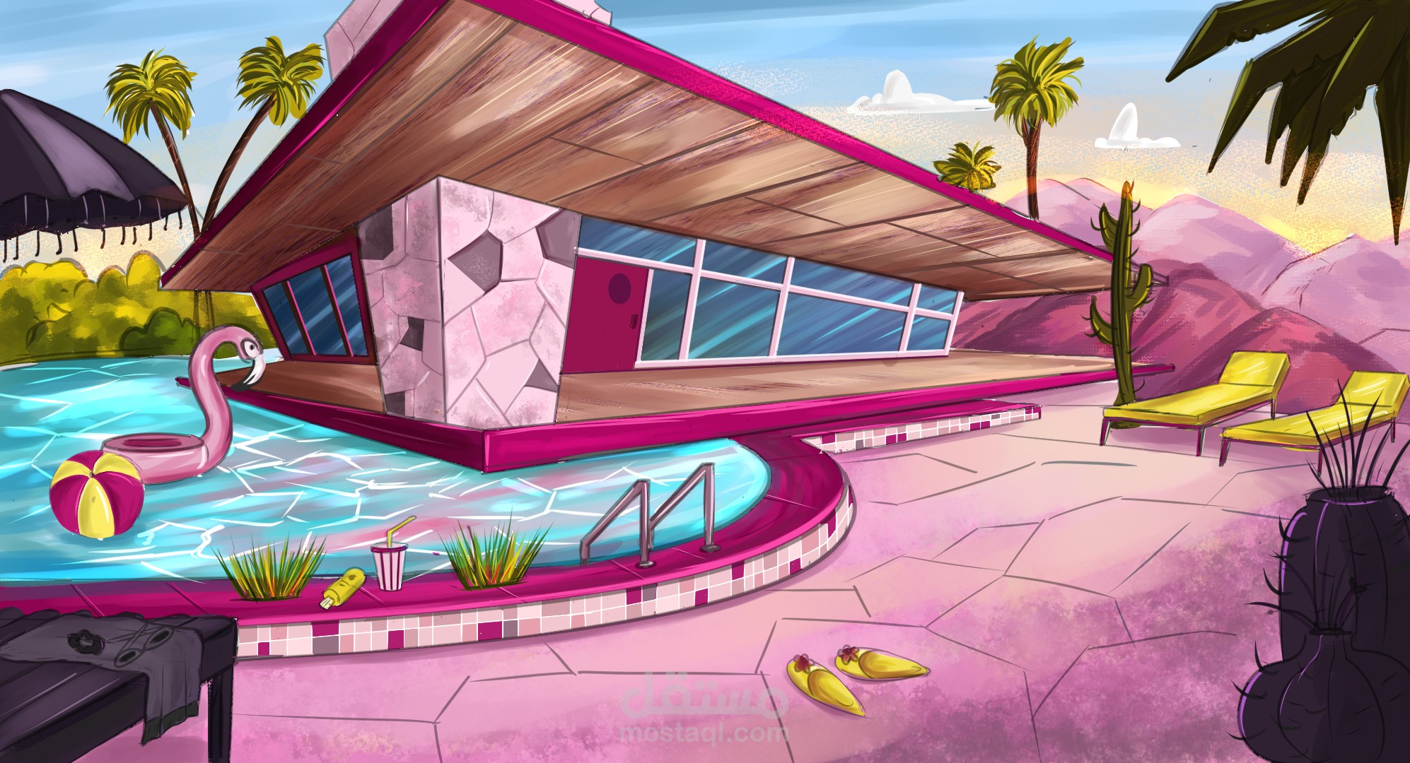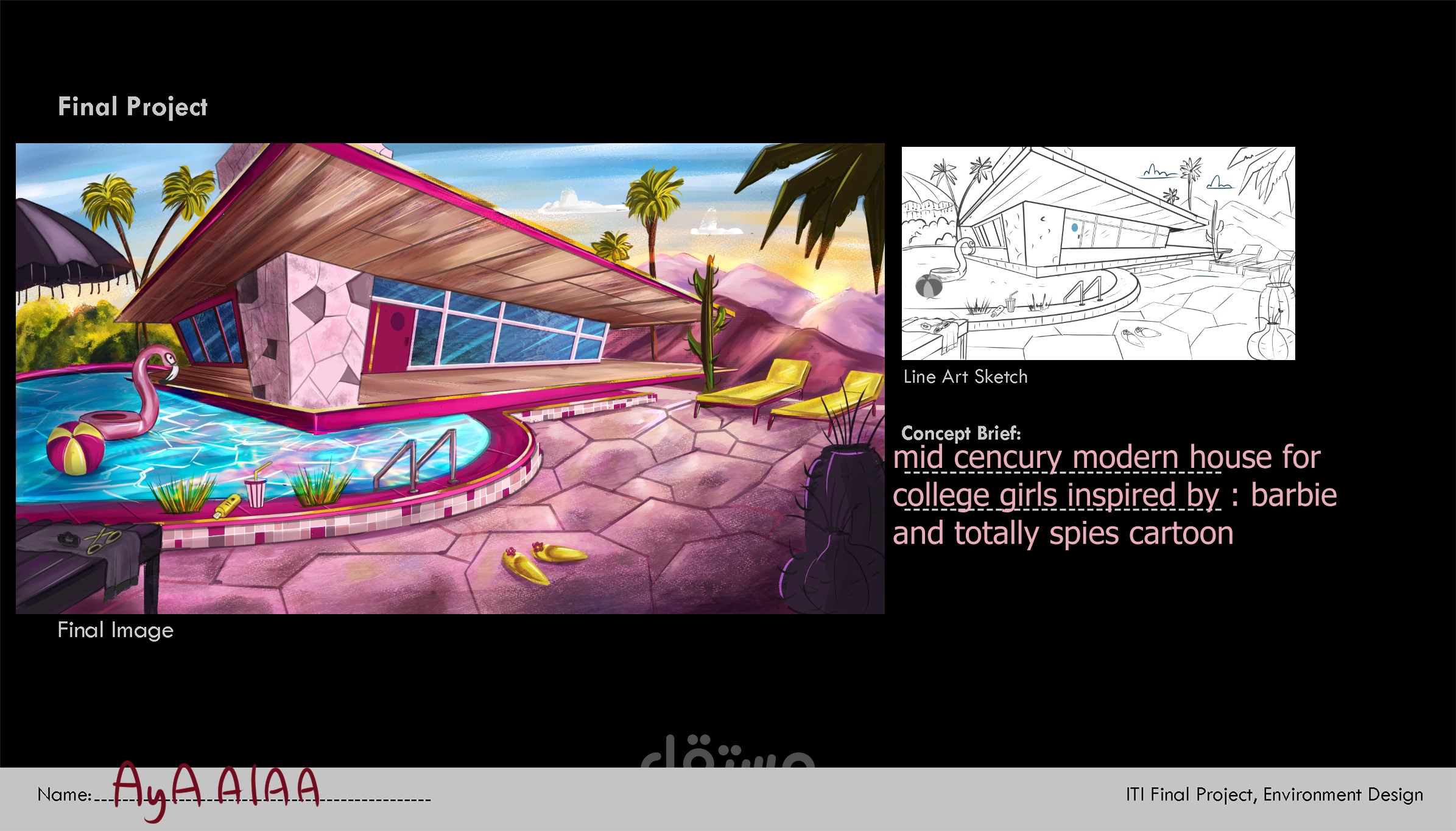 تصميم خلفية خارجية لبيت يعيش فيه بنات جامعيات التصميم مستوحى من ال mid century modern style