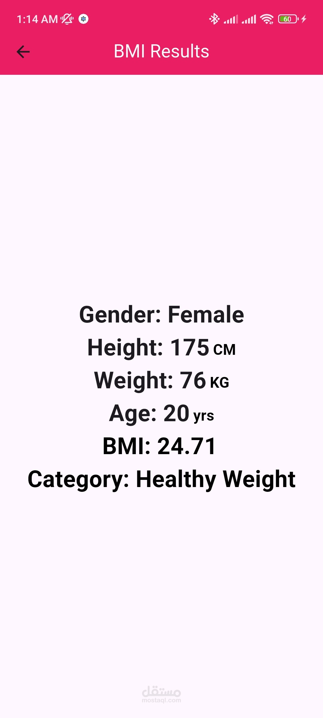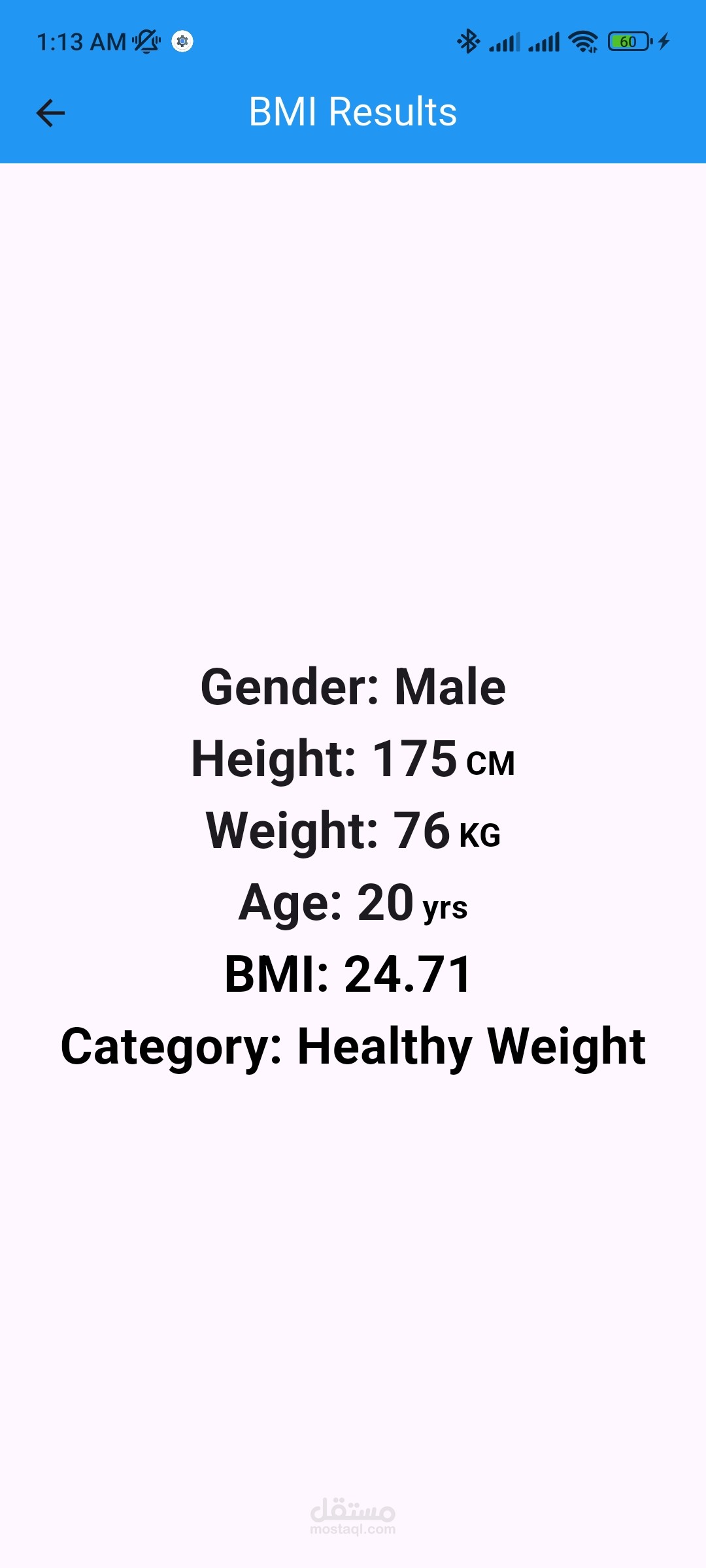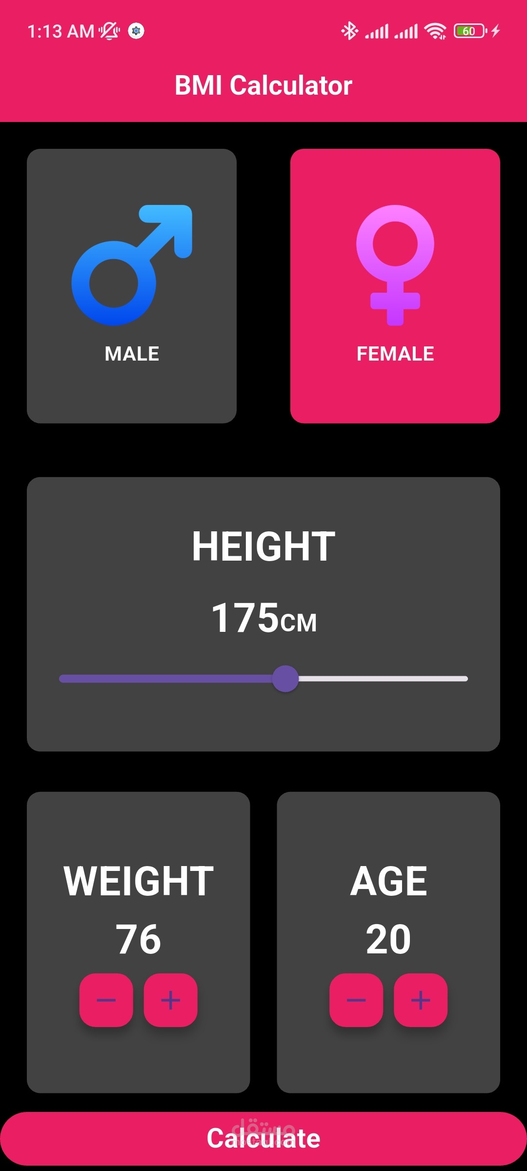 حاسبة مؤشر كتلة الجسم بتصميم بسيط مع بعض التأثيرات البسيطه كتغير اللون من ازرق الي وردي عند الاختيار بين Male و Female وينطبق تغير اللون علي صفحة النتائج وتكون صفحة النتائج عبارة عن ملخص لأختيارات المستخدم ونتيجة العملية الحسابية وتصنيف وزنك إذا كان وزنك صحيا او نحيف او زائد