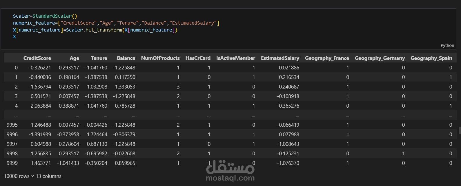 دراسة الإحصائيات الوصفية لمتغيرات مثل الرصيد (Balance)، العمر (Age)، الدخل التقديري (Estimated Salary)، وغيرها.
