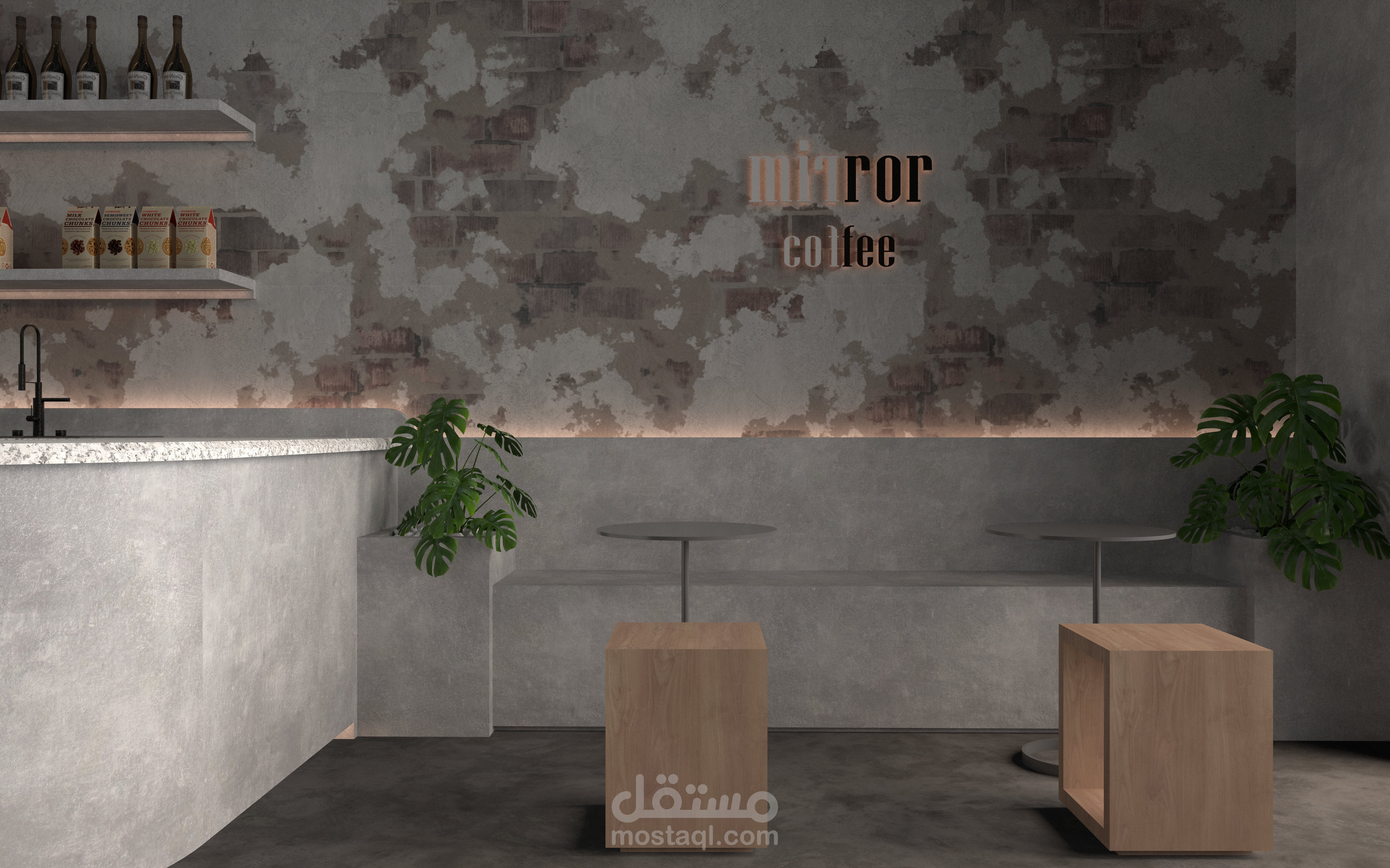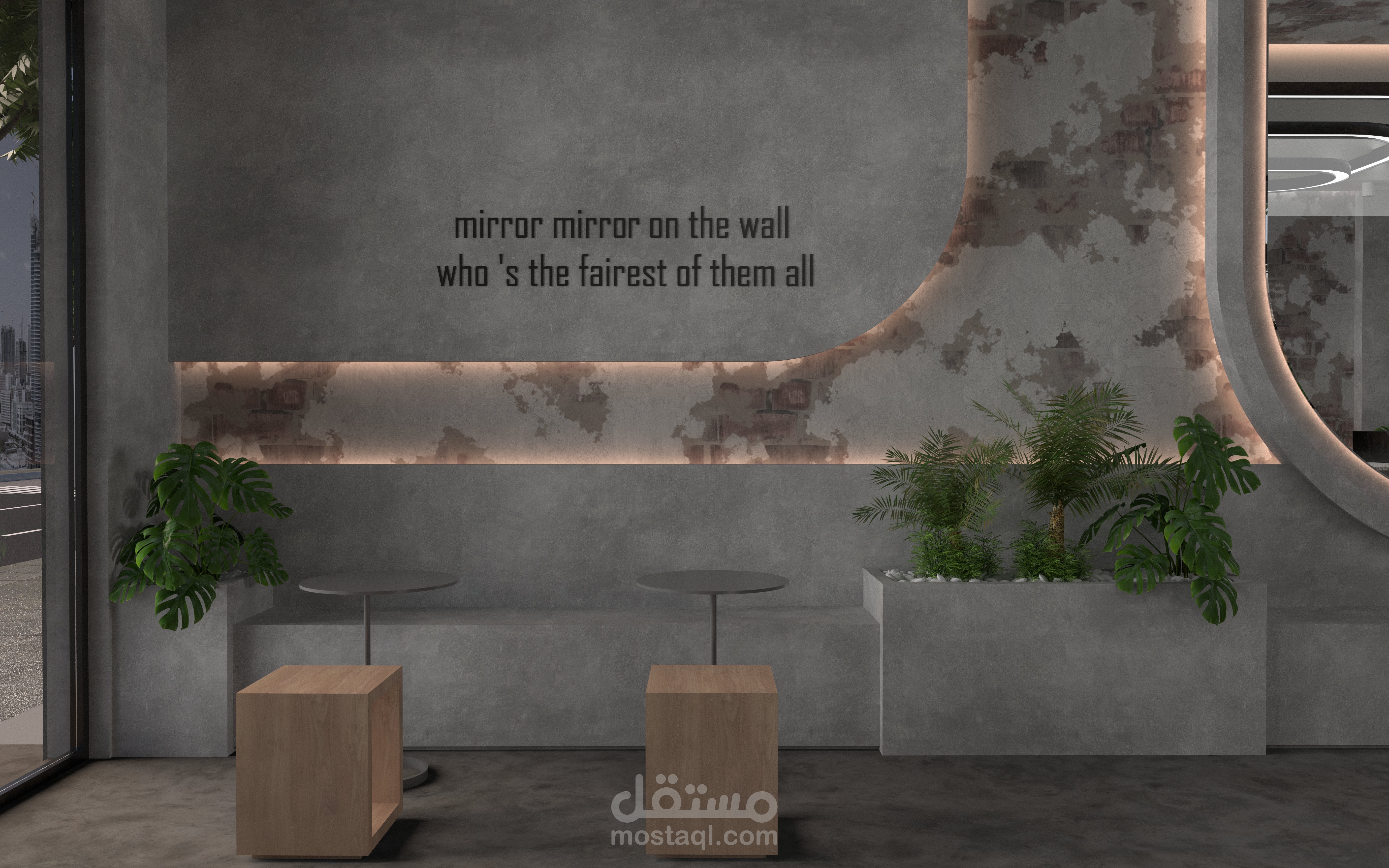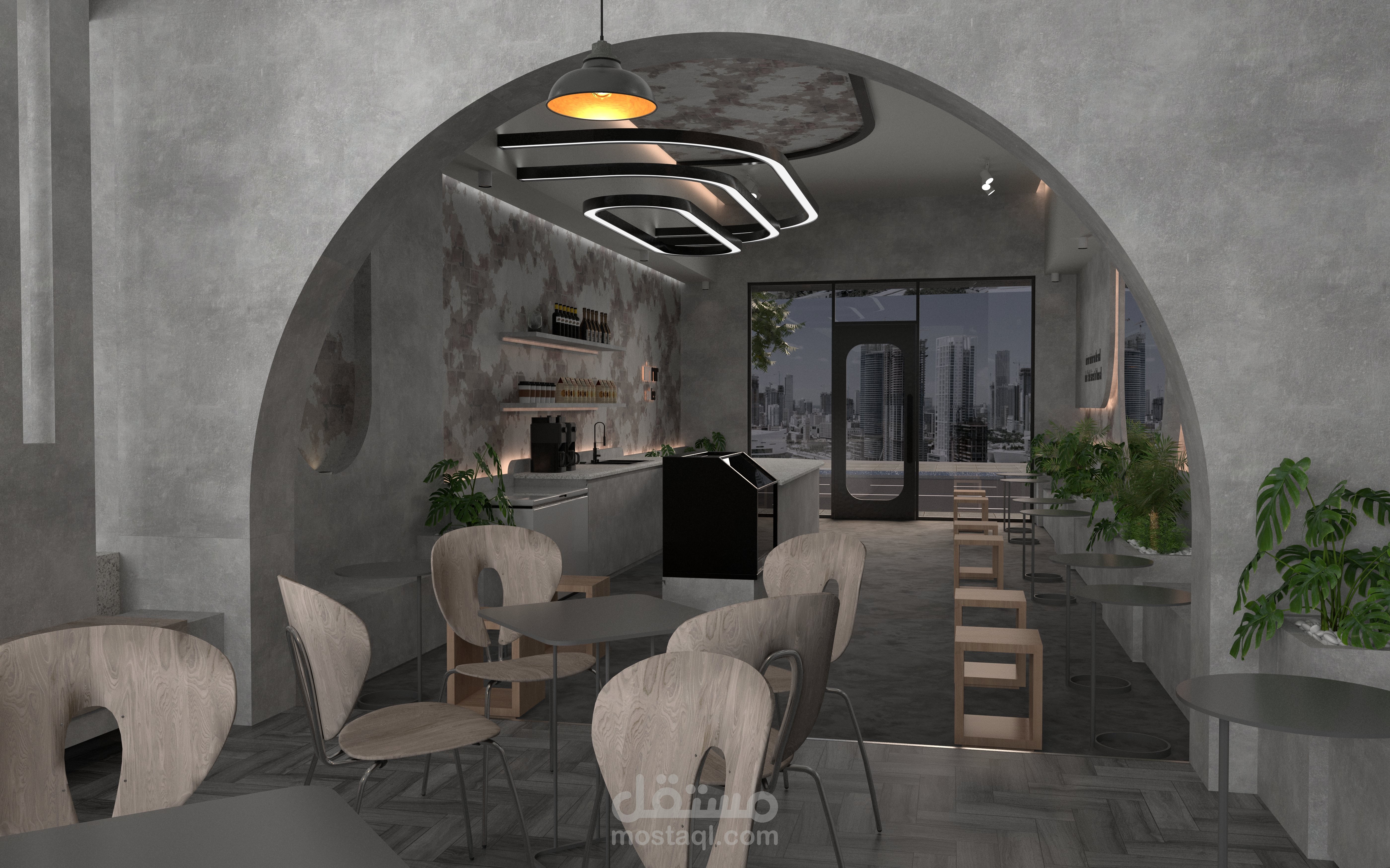 تصميم داخلي لمقهى عصري يعكس مفهوم البساطة الصناعية بلمسة فنية مبتكرة. يتّسم المشروع باستخدام خامات خرسانية رمادية تعزز الإحساس بالهدوء والحداثة. يلفت الانتباه القوس المعماري الذي يفصل بين منطقتين من المقهى، مضيفًا عمقًا وبعدًا بصريًا جذابًا. السقف مزدان بعناصر إضاءة معلقة هندسية الشكل تخلق تباينًا ديناميكيًا مع الأسطح الناعمة. توزيع الطاولات والكراسي الخشبية جاء متوازنًا، ما يمنح المستخدم تجربة مريحة وخصوصية مدروسة. الإضاءة الدافئة تسلط الضوء على الخامات والملمس، بينما توفر النوافذ إطلالة بانورامية على المدينة. لمسة النباتات الطبيعية على الجوانب تخلق توازناً بصرياً وتضيف روحًا للمكان. المشروع يُظهر فهمًا عميقًا للتناغم بين التصميم الجمالي والوظيفي.