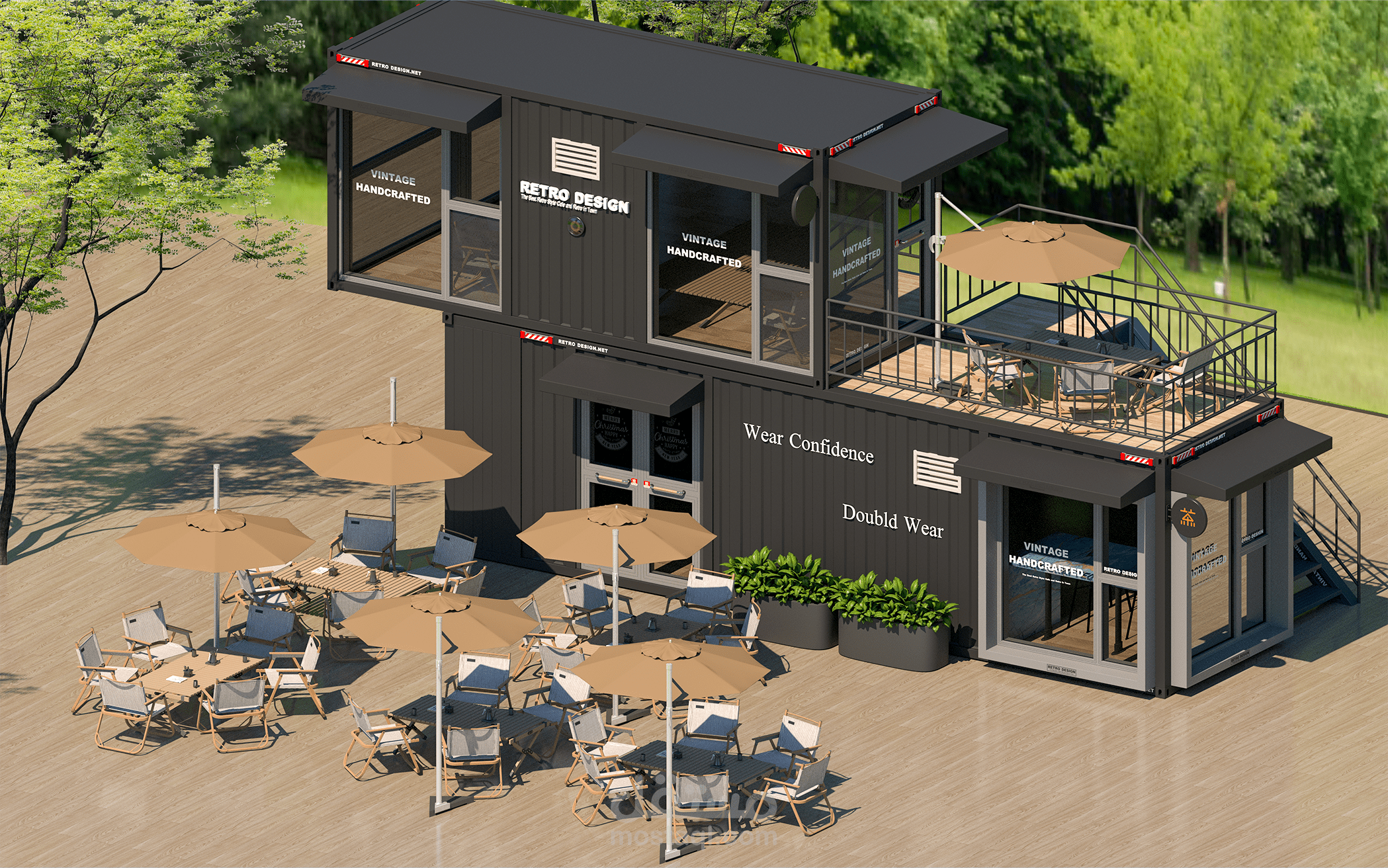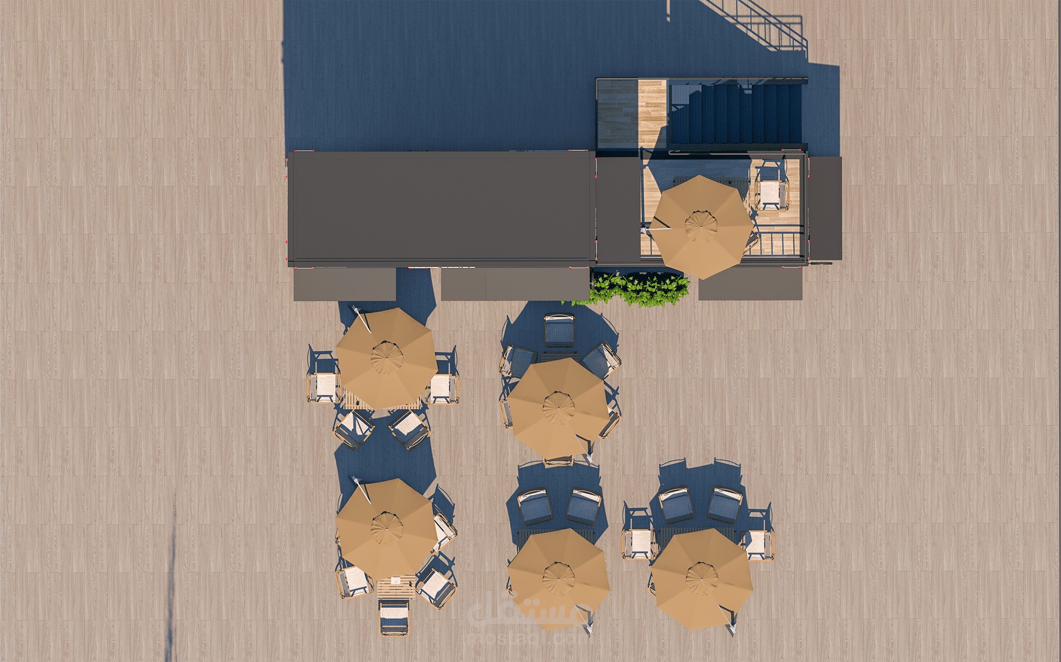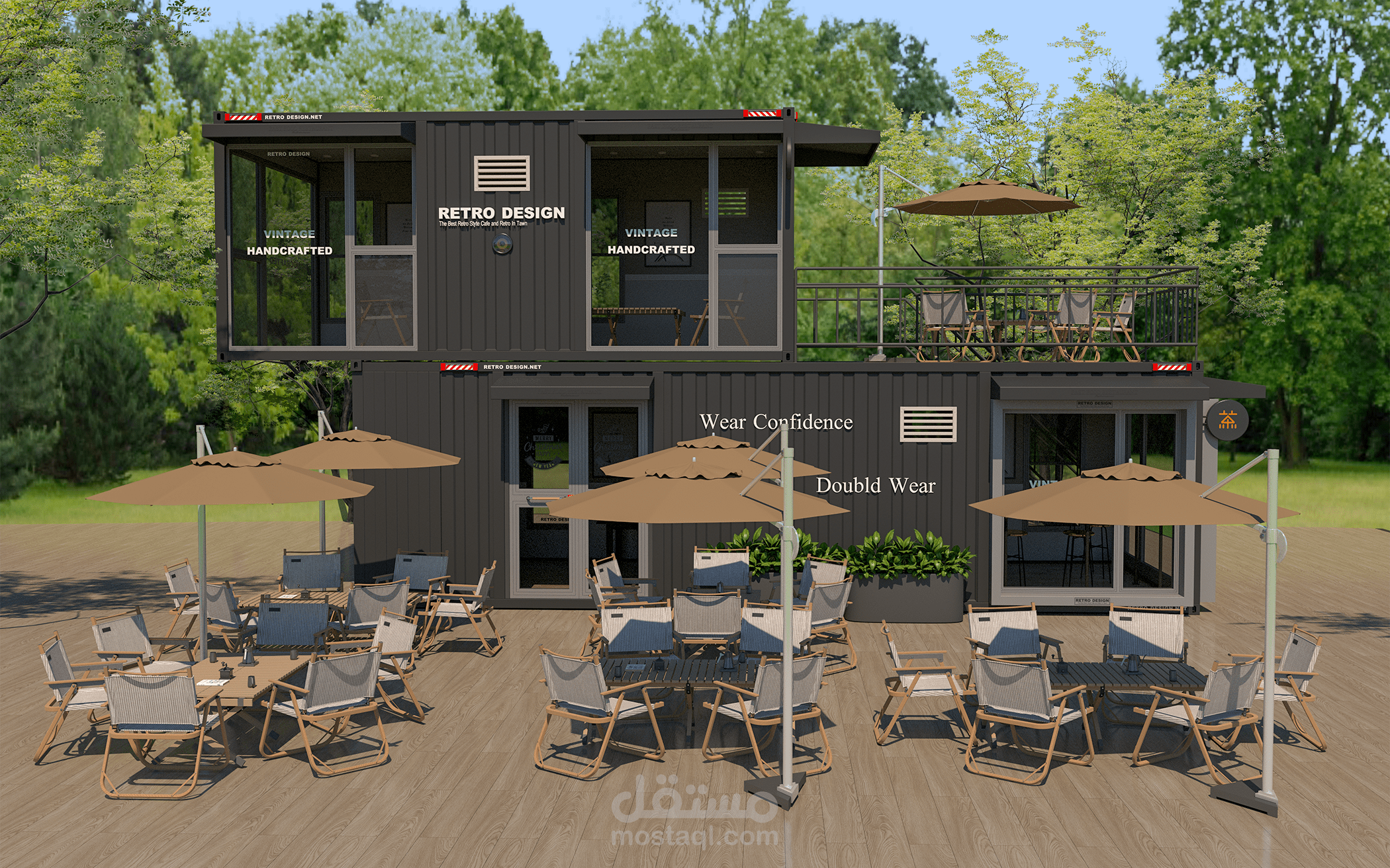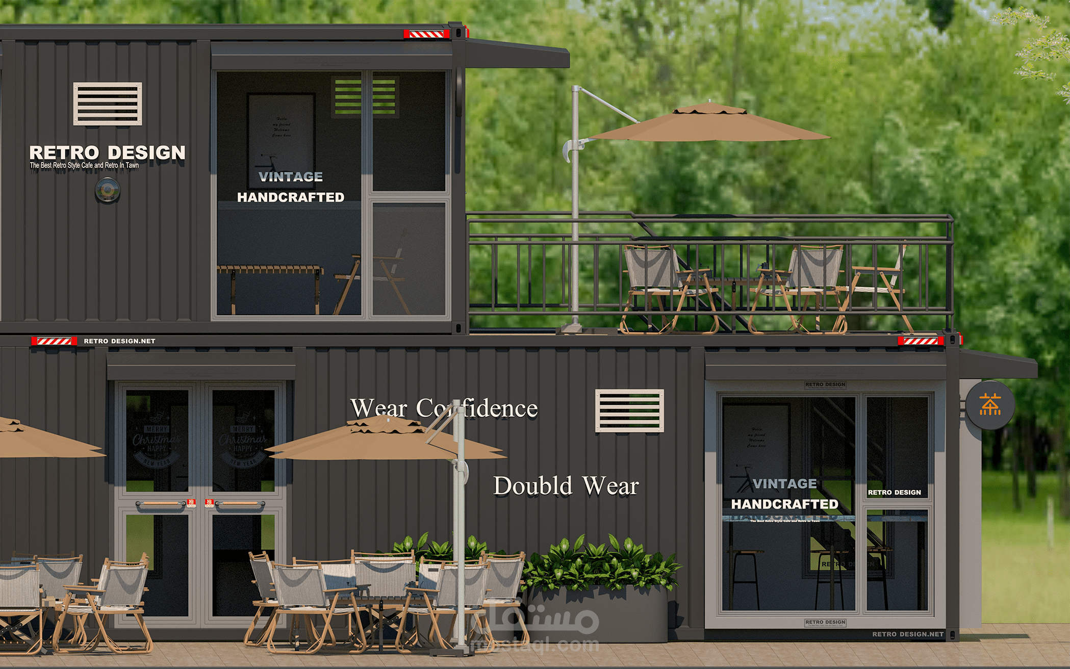 تصميم معماري مبتكر لمتجر ومقهى مزدوج مكوّن من حاويات شحن معدلة بطابع صناعي عصري. يجمع المشروع بين البساطة والوظيفية، ويتميز بتوزيع ذكي للمساحات على طابقين، مع جلسات خارجية مريحة ومظللة. الطابق الأرضي مخصص للعرض واستقبال الزبائن، بينما يضم الطابق العلوي جلسات أنيقة على التراس بإطلالة طبيعية خلابة. تم استخدام مواد عالية الجودة مع الحفاظ على الطابع الريترو في التصميم الداخلي والخارجي. يبرز المشروع الهوية البصرية للعلامة التجارية من خلال شعارات واضحة وتصميم جرافيكي أنيق. مناسب للعلامات التجارية المختصة بالأزياء أو القهوة أو المنتجات الحرفية. تصميم مستدام وقابل للنقل والتركيب بسهولة. مثالي للمناطق المفتوحة مثل الحدائق أو الفعاليات المؤقتة.