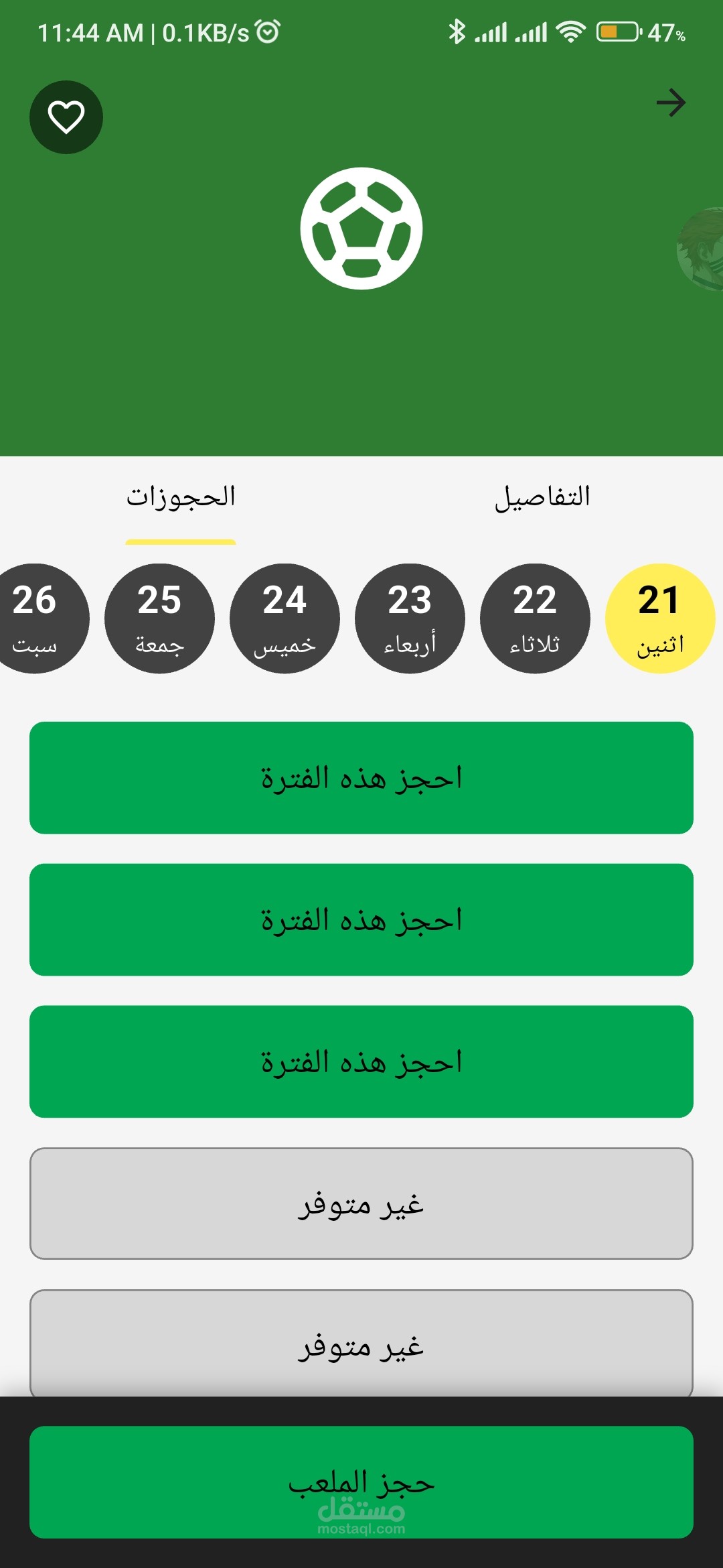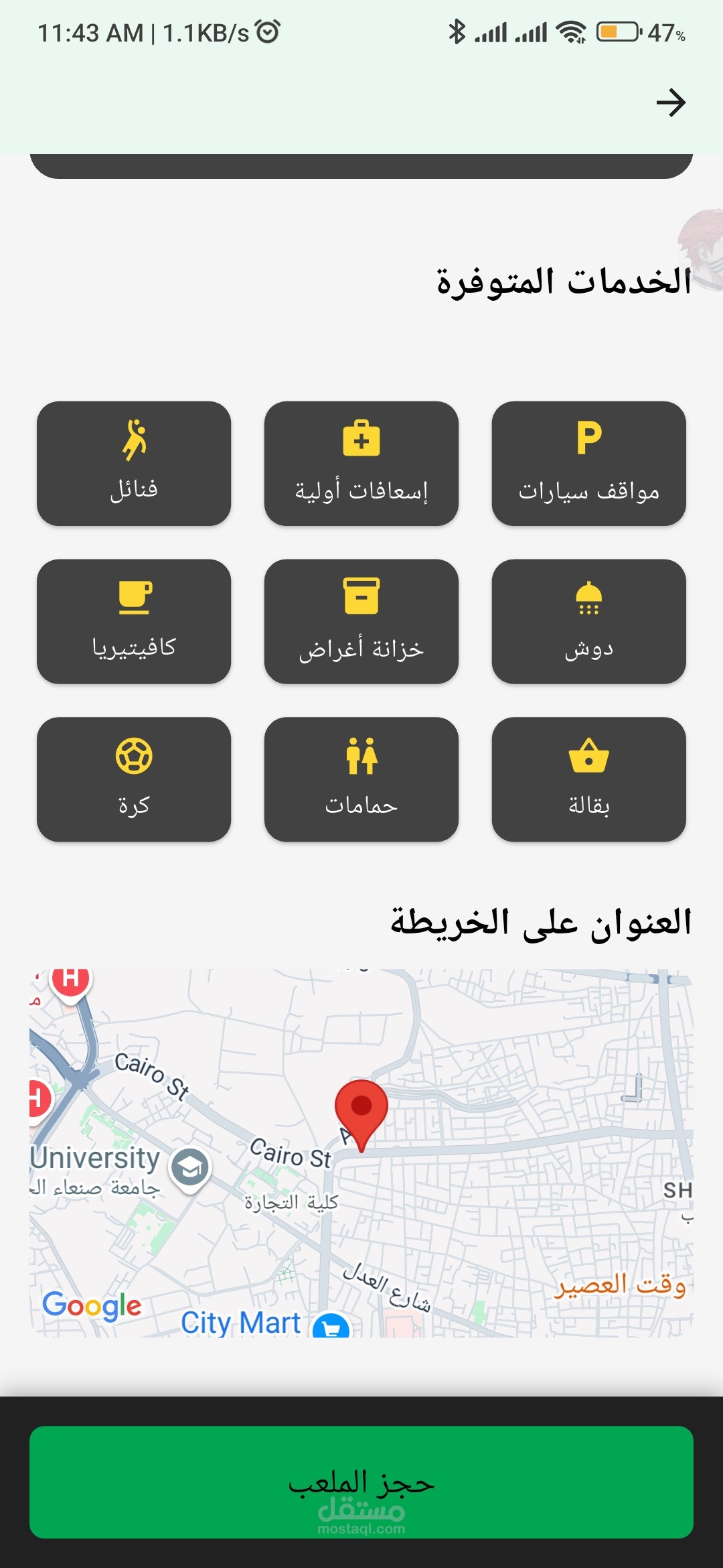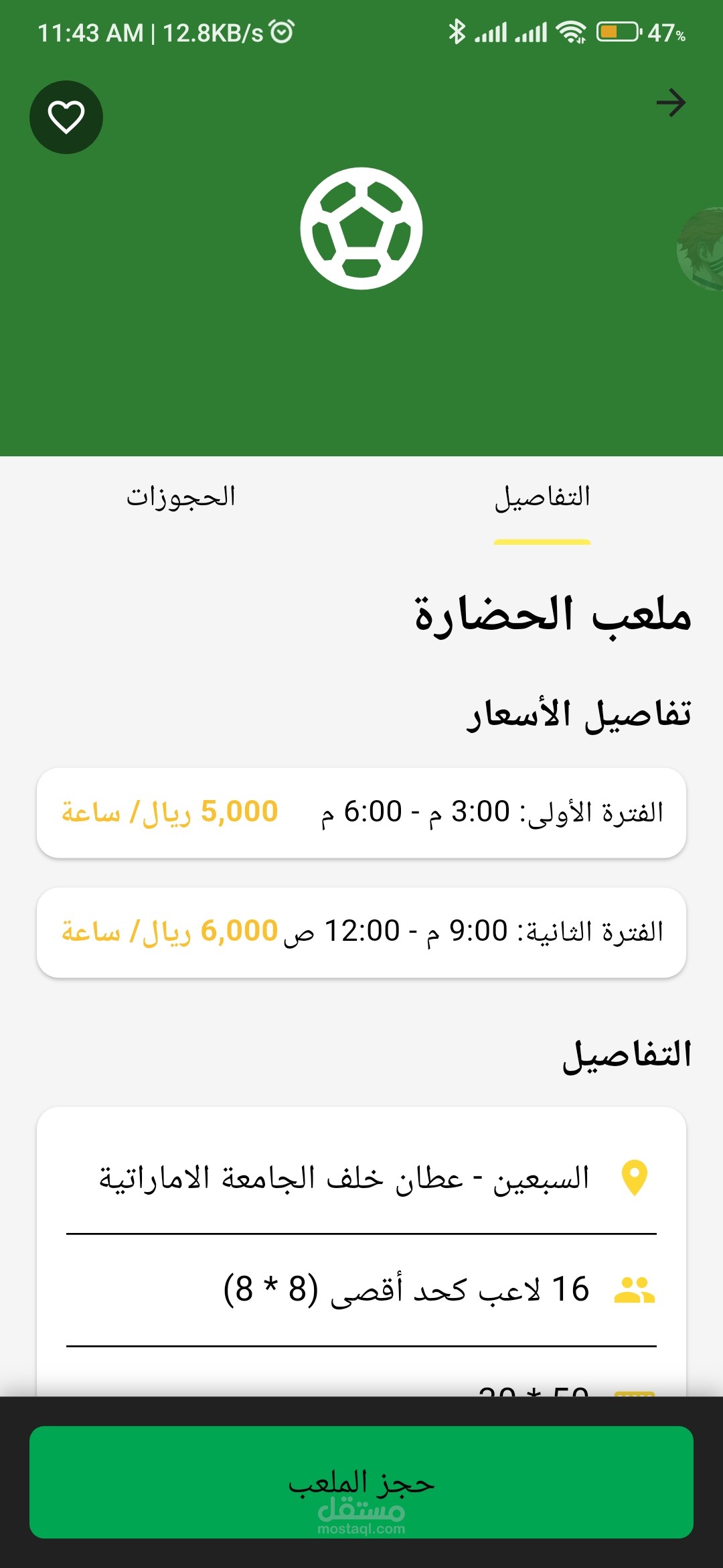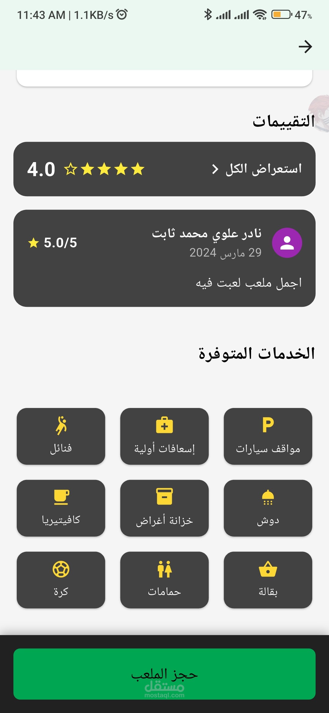 تأكيد الحجز مع عرض تفاصيل الملعب (صور – خدمات – التقييمات).