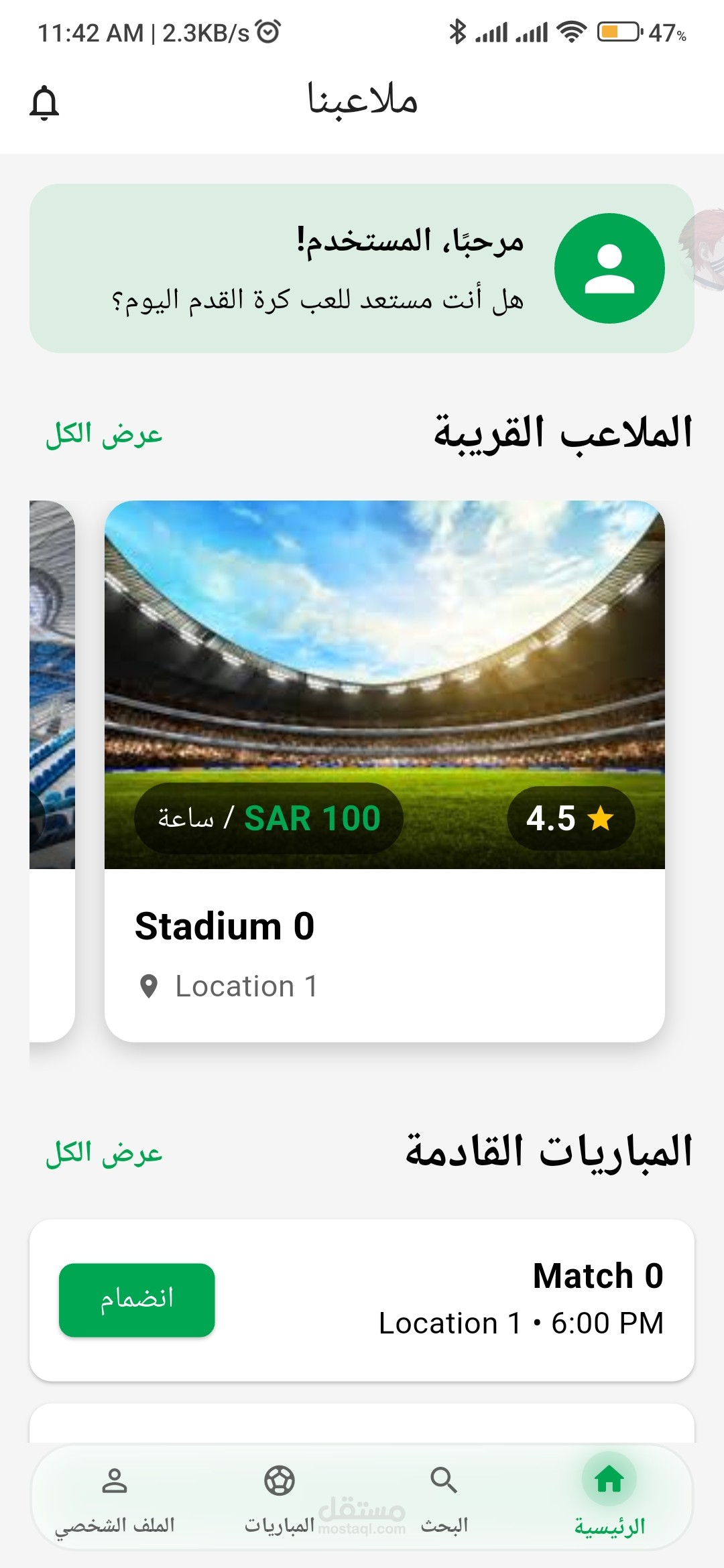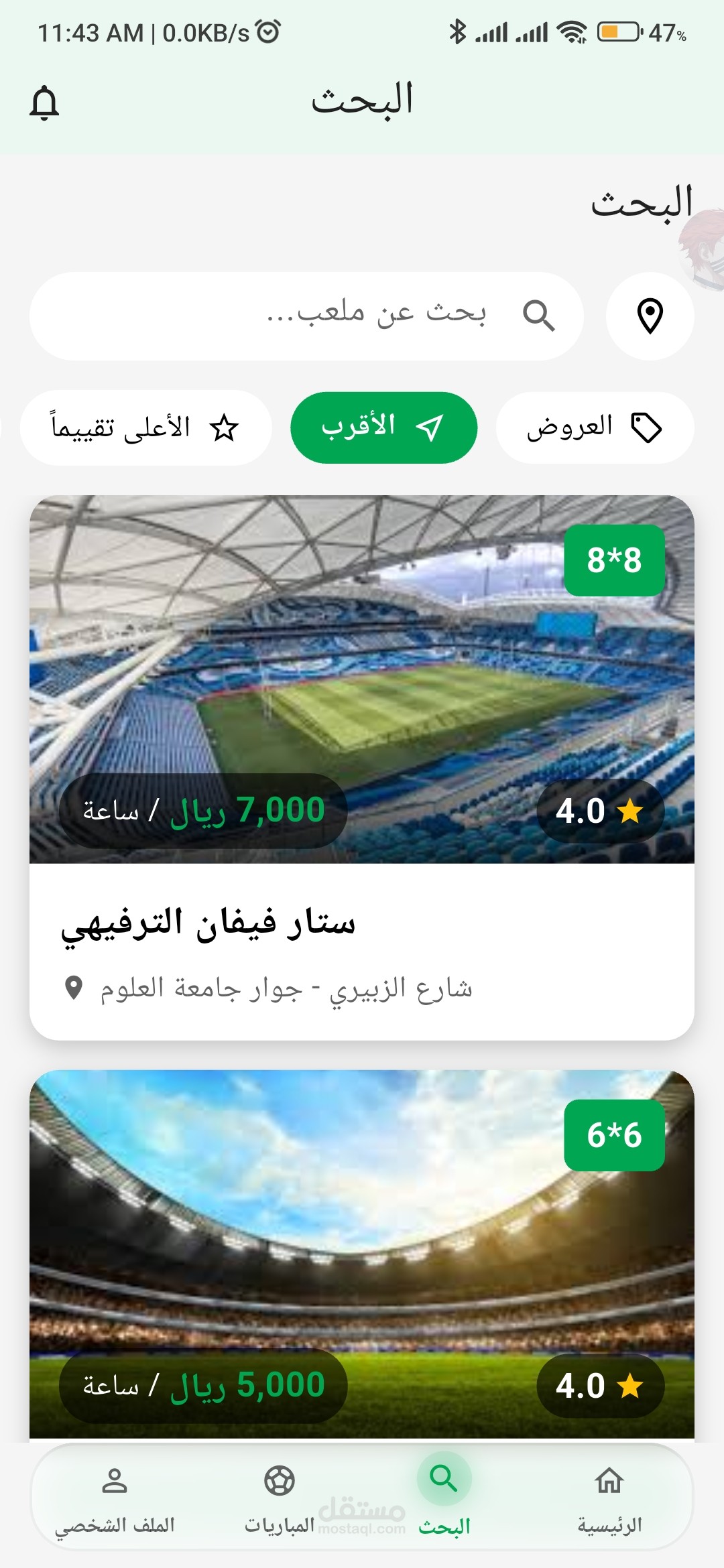 عرض الملاعب المتوفرة بالقرب من المستخدم.