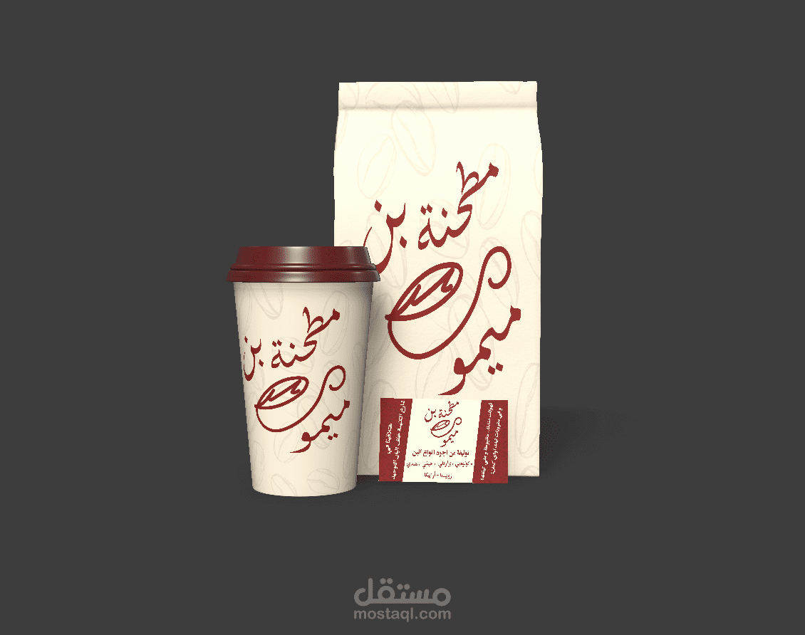 يحتوي علي لوجو المطحنة (مطحنة بن ميمو) و هو عبارة عن مطحنة بن ميمو مكتوبة و بالوسط يوجد كوب قهوة مرسوم عليه حرف الM نبسة لميمو. يوجد اعلان لافتة للمكان و تصميم مبدأي بشكل الكوب و اكياس القهوة التي يتم بيعها و كارت.