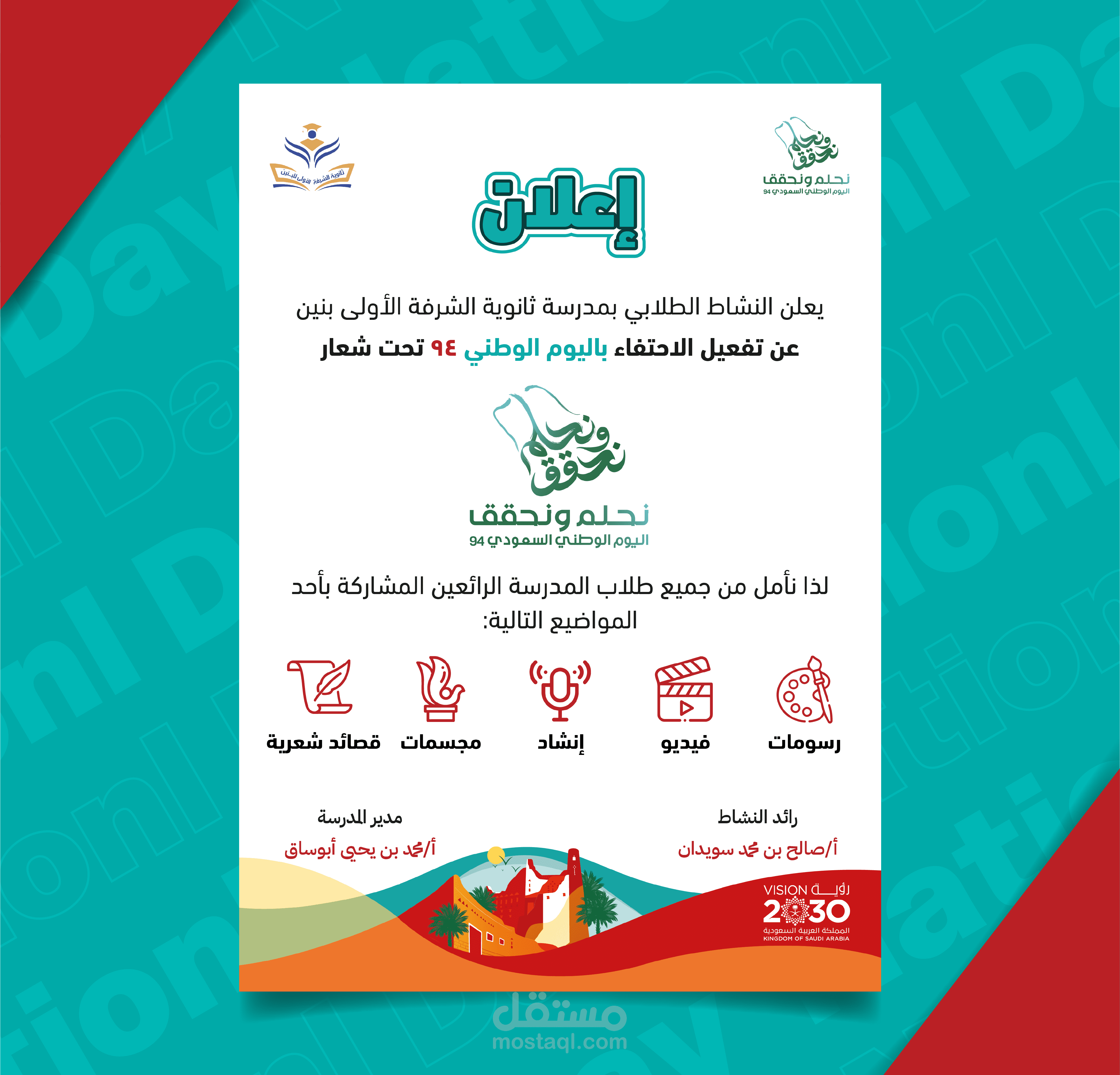 قمت بتصميم فلايرين احترافيين للاحتفال باليوم الوطني السعودي ، حيث يتضمن الفلاير الأول معلومات عن الفعالية والأنشطة التي ستقام، بينما يركز الفلاير الثاني على دعوة الطلاب للمشاركة في الاحتفال. استخدمت برامج التصميم الجرافيك مثل Adobe Illustrator وPhotoshop لإنشاء تصاميم جذابة تعكس الهوية الوطنية .