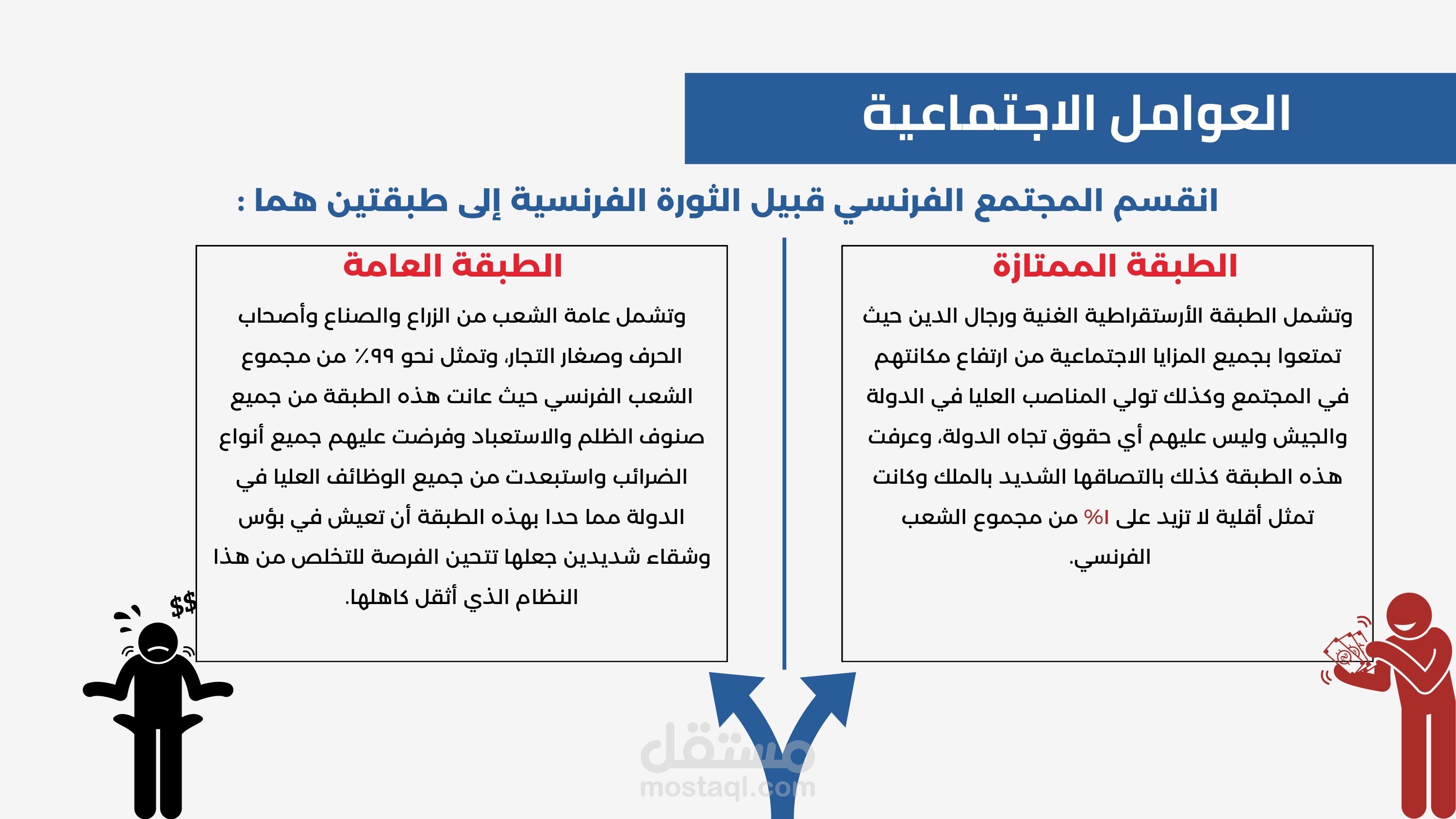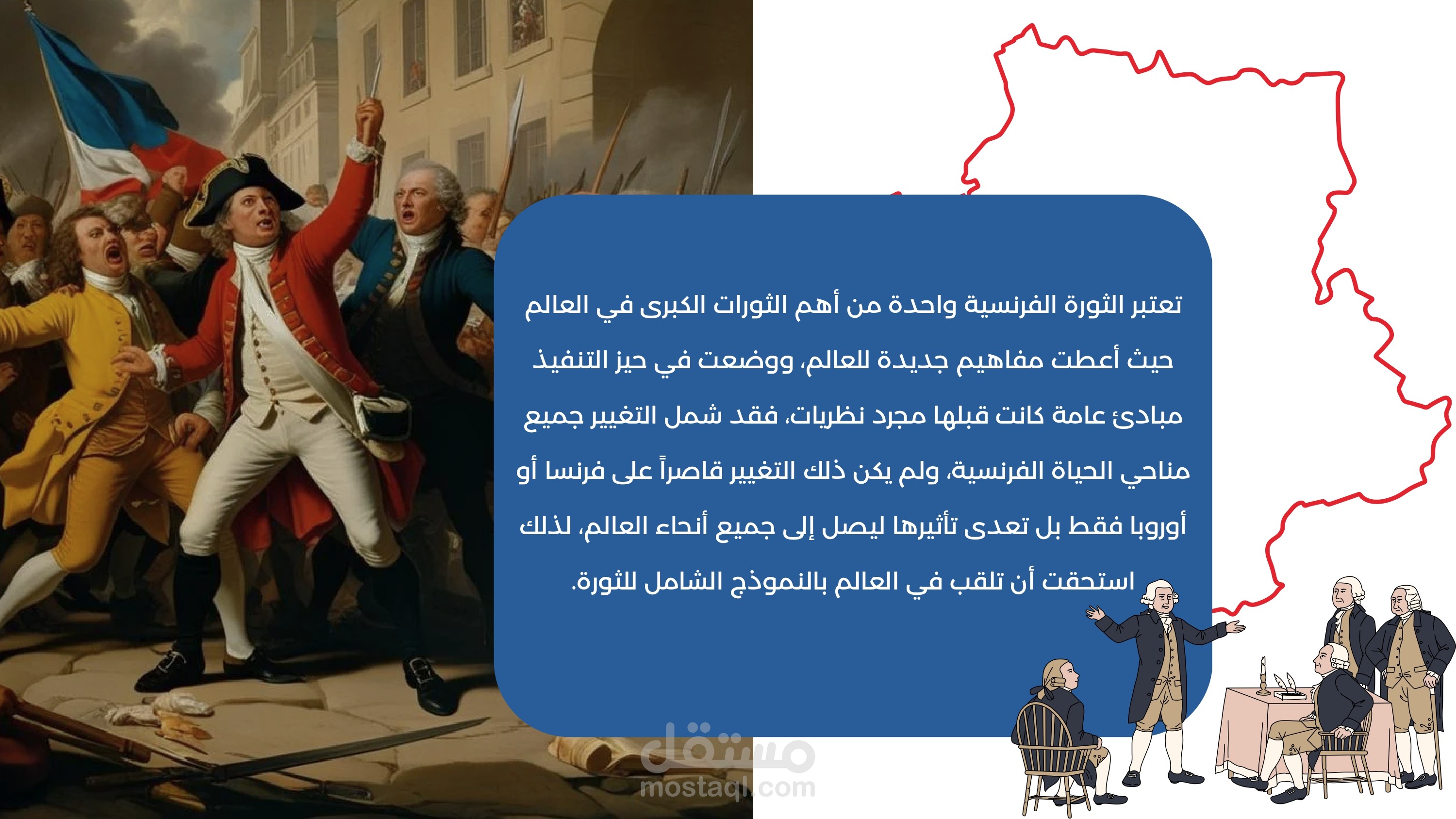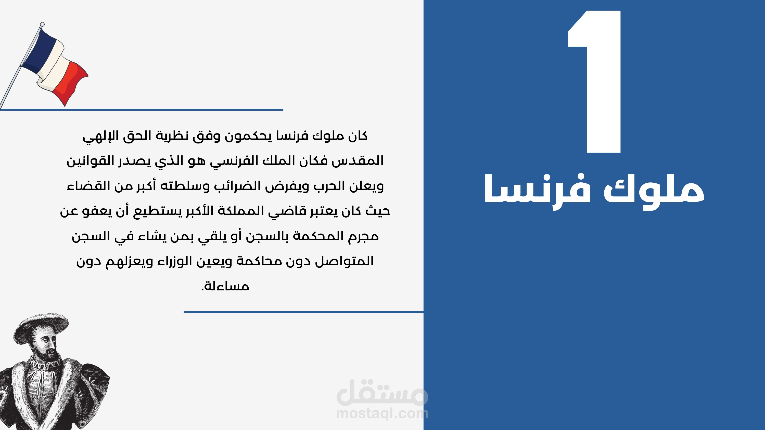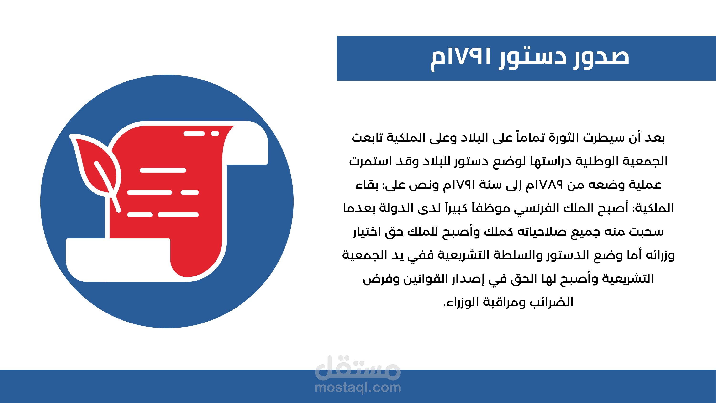 عينة لمشروع تعليمي باللغة العربية من 5 شرائح في مادة التاريخ بعنوان الثورة الفرنسية، مٌقدم إلى المرحلة الثانوية قمت بإستخدام اللون الأزرق ليناسب علم الدولة كما قمت بالتوسع في كتابة المعلومات لأن هو عرض تعليمي هدفه سرد المعلومات بشكل جذاب وممتع للطلاب.
