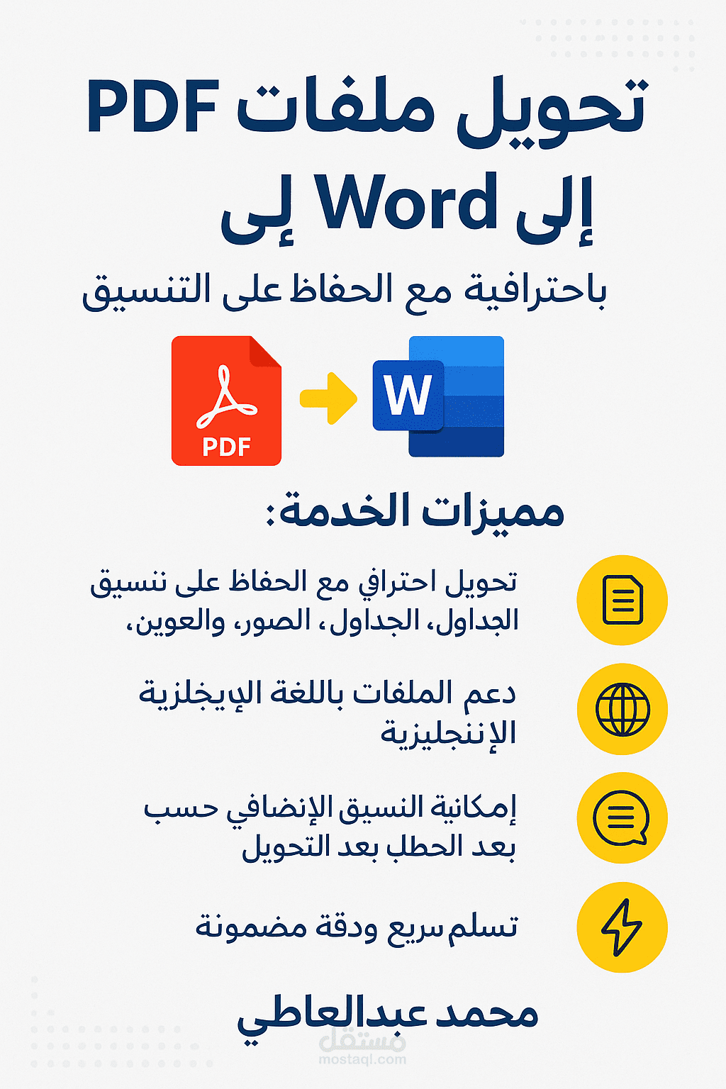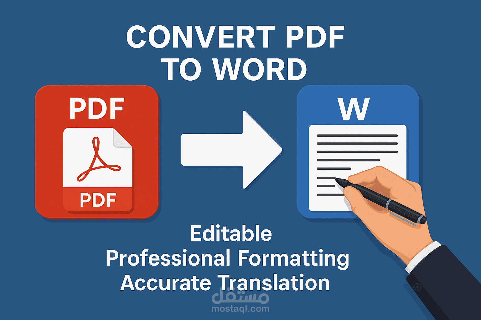 أقدم لك خدمة تحويل احترافية ودقيقة تضمن الحفاظ الكامل على تنسيق النصوص، الصور، الجداول، والعناوين كما هي في الملف الأصلي.