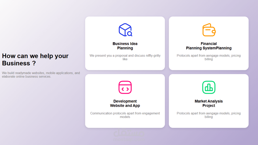 الخدمات (How We Help): عرض ٤ خدمات رئيسية (Business Idea Planning, Financial Planning...).