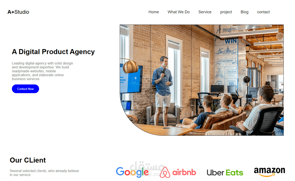 Hero Section: عنوان تعريفي بالوكالة مع زر (Contact Now) وصورة اجتماع فريق عمل.