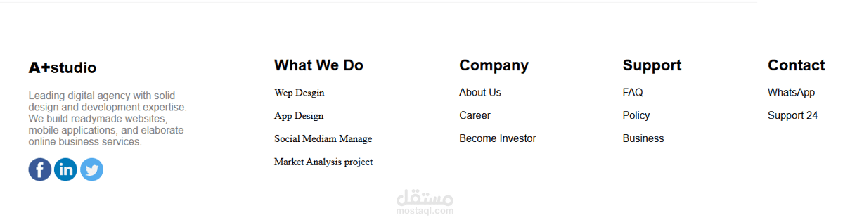 fotter: روابط (What We Do, Company, Support, Contact) مع أيقونات التواصل.