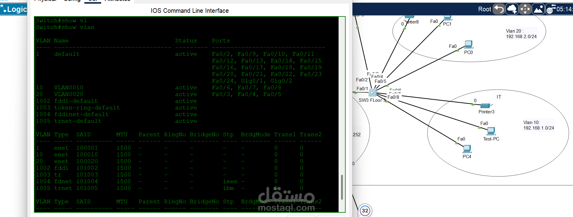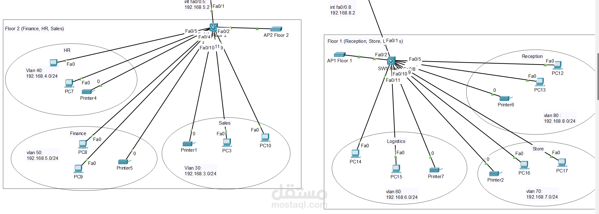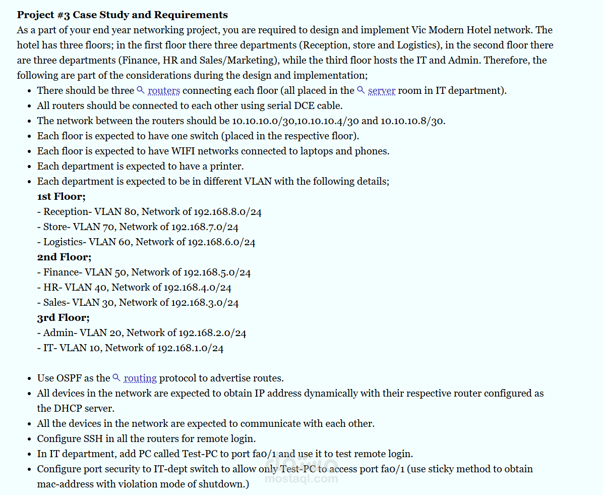 يهدف المشروع إلى تصميم شبكة لفندق مكوّن من 3 طوابق وكل طابق يحتوي على أقسام مختلفة، يتم ربطها عبر 3 راوترات باستخدام OSPF. يتم توزيع VLANs لكل قسم، وتفعيل DHCP وSSH، مع إعداد Port Security لقسم الـ IT. تُستخدم عناوين IP محددة بين الراوترات، وكل طابق يحتوي على Wi-Fi، طابعة، وسويتش.