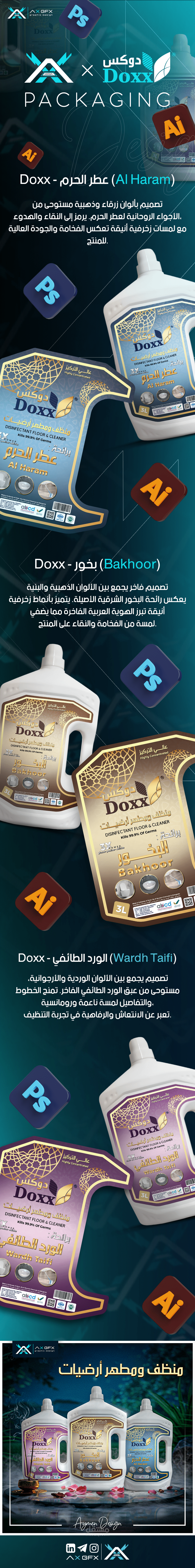 تشرفت بالعمل على تصميم ملصقات منتجات التنظيف الخاصة بشركة DOXX ، حيث كان الطلب واضحًا بضرورة دمج زخرفات إسلامية راقية تعكس الطابع الشرقي الأصيل وتعزز هوية العلامة التجارية.