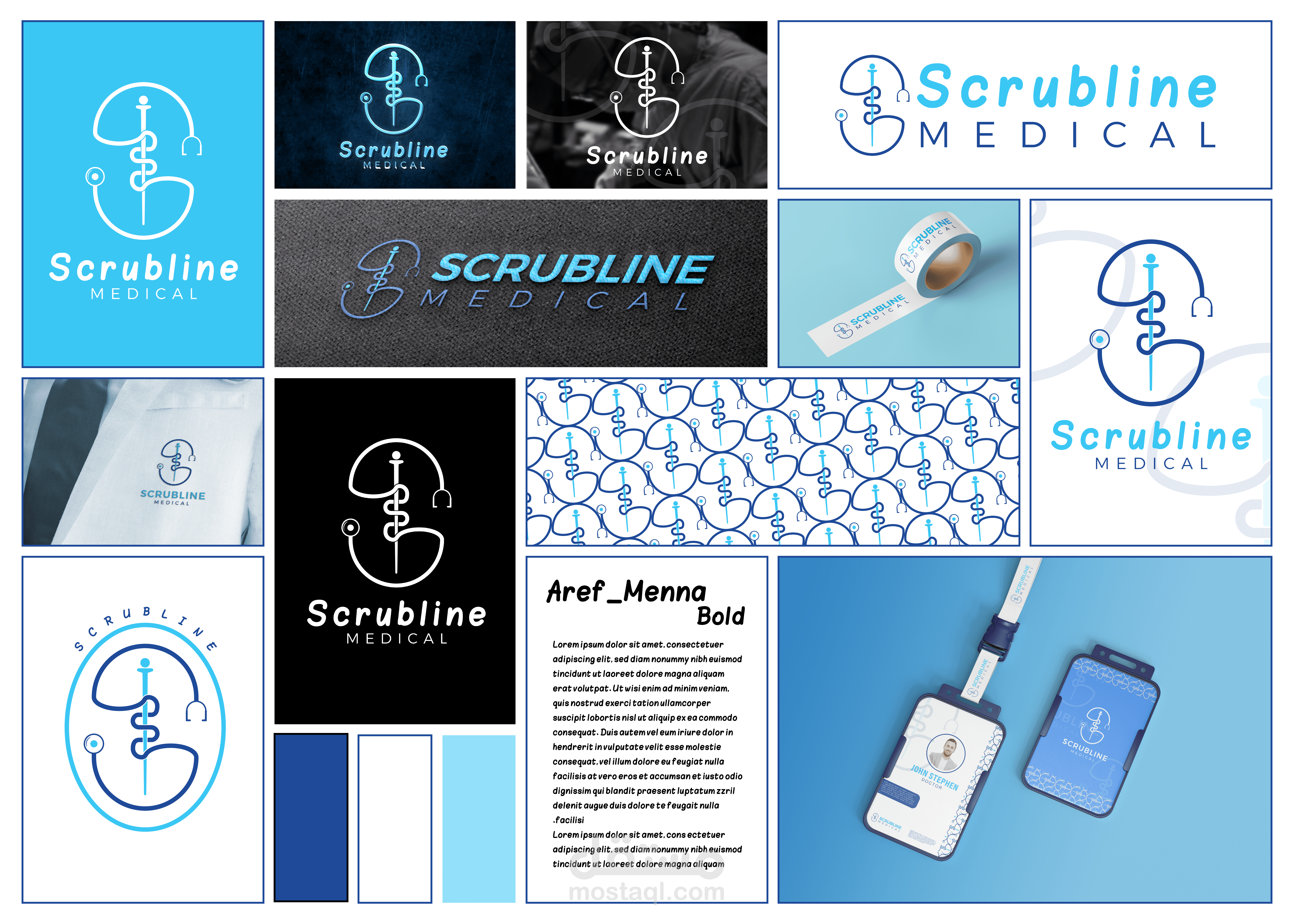 This logo was designed for SCRUBLINE MEDICAL, a brand specializing in the medical field. It combines traditional medical symbols like the Rod of Asclepius and a stethoscope to create a visual identity that reflects professionalism and credibility in healthcare.