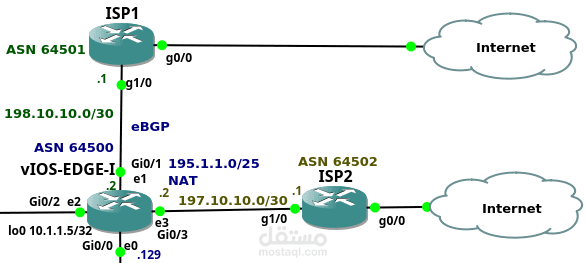 Handled by vIOS-EDGE-I, which connects to two ISPs: