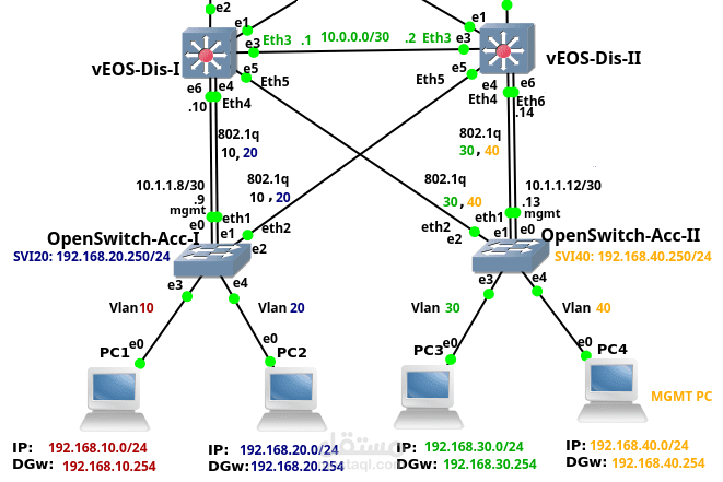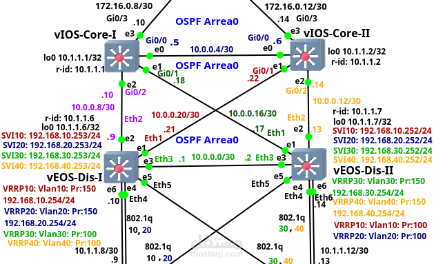 vEOS-Dis-I acts as the distribution switch and uses VRRP to provide high availability default gateways for VLANs.