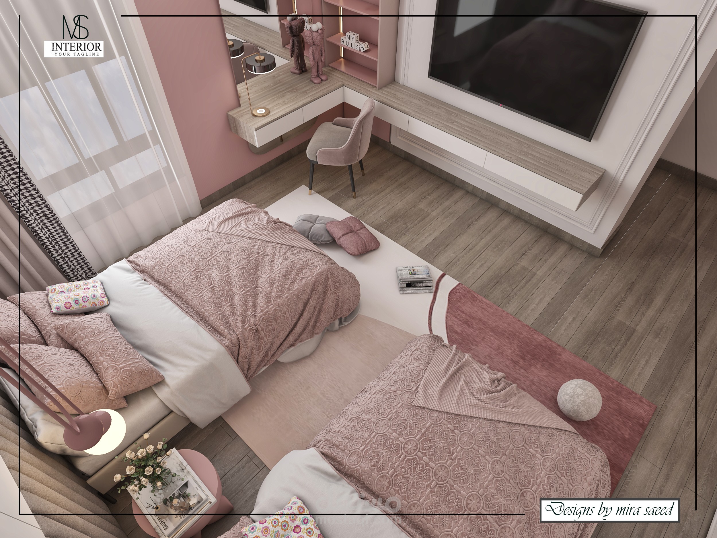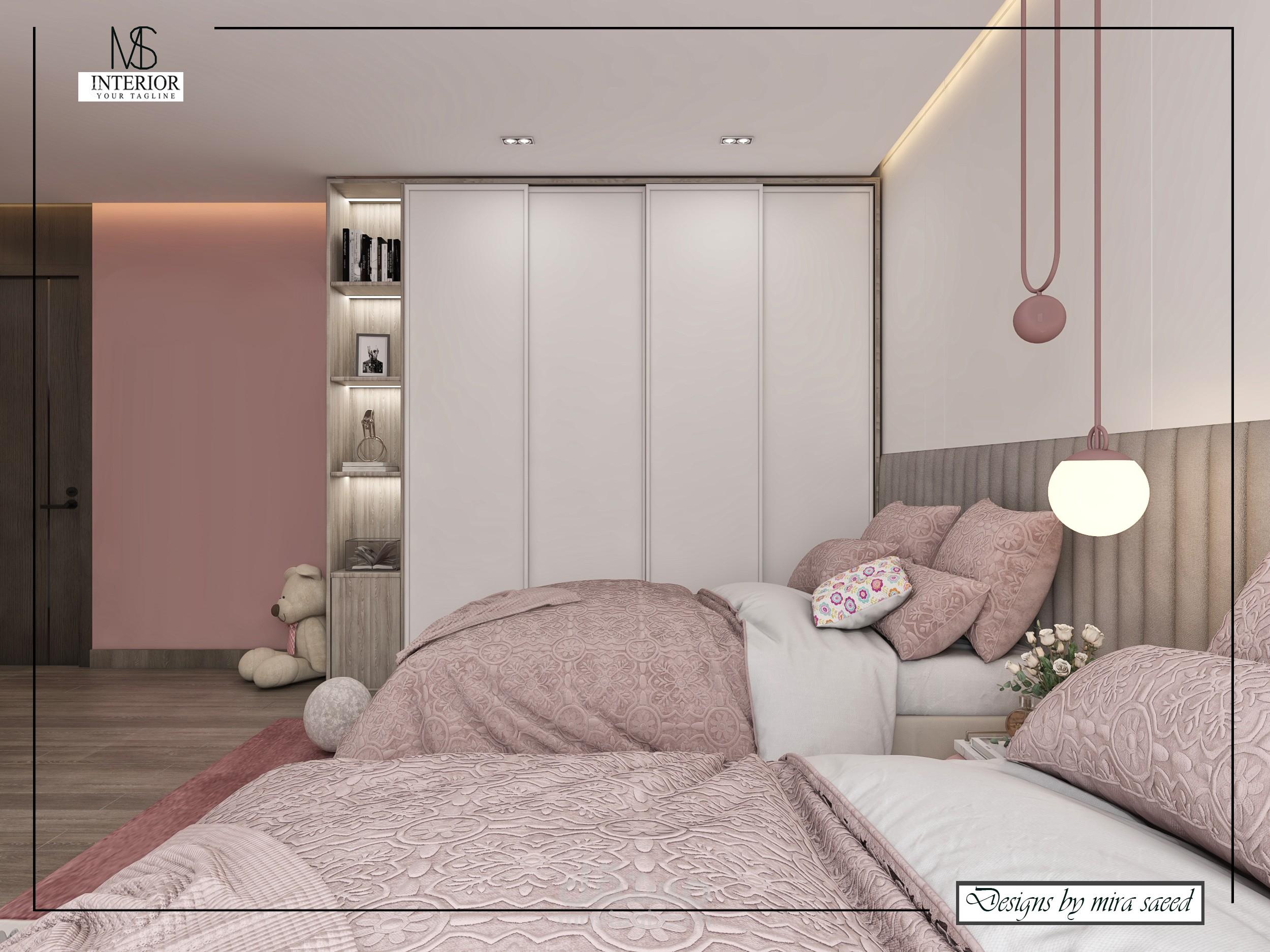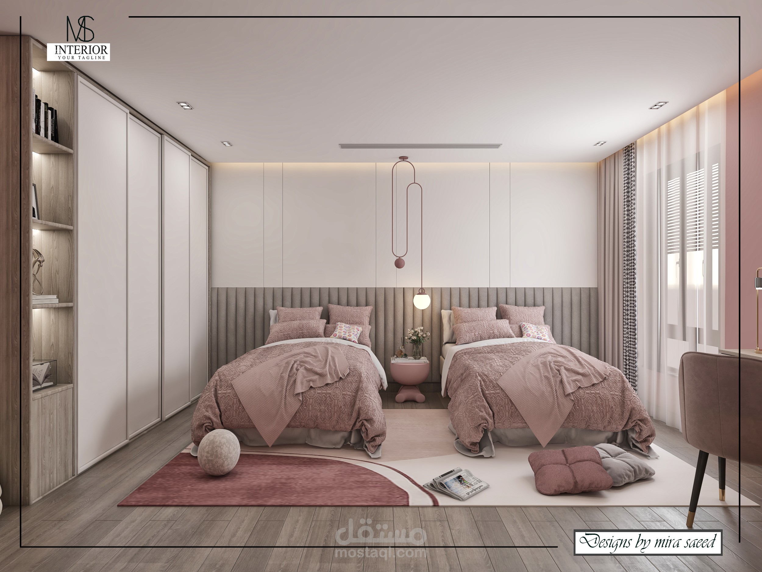 تصميم غرفة نوم أطفال يعتمد على التماثل في توزيع الأسرة لتحقيق التوازن البصري والتنظيم الوظيفي. تم استخدام ألوان هادئة وخامات ناعمة لرفع مستوى الراحة النفسية، مع إضاءة مباشرة وغير مباشرة مدروسة تدعم الاستخدام اليومي وتوفر بيئة آمنة ومريحة للنوم والدراسة.