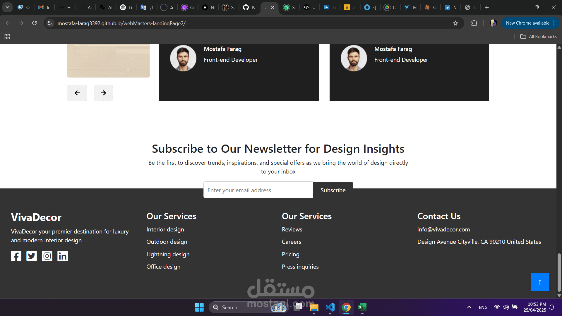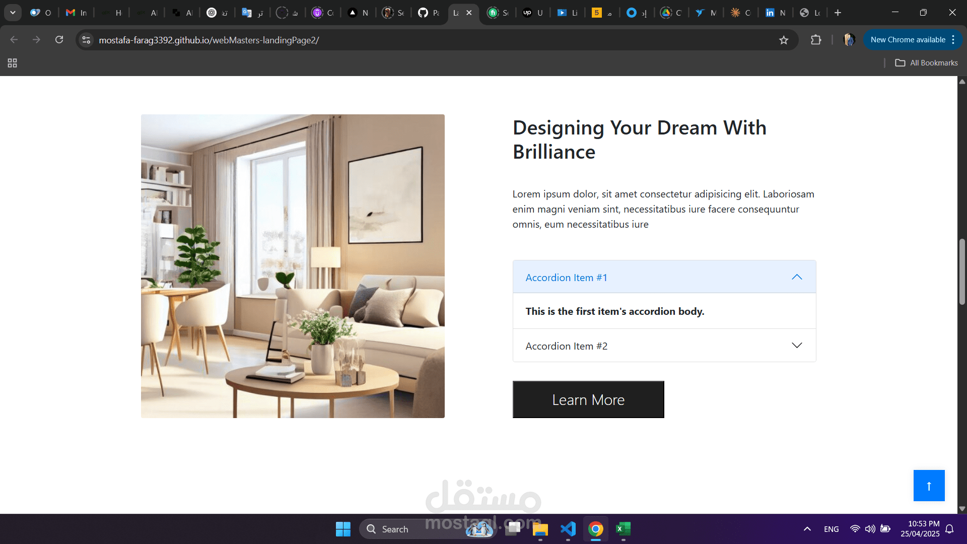 المشروع عبارة عن صفحة هبوط (Landing Page) لمجال التصميم الداخلي قمت بتطويرها بالكامل كمطور واجهات أمامية.