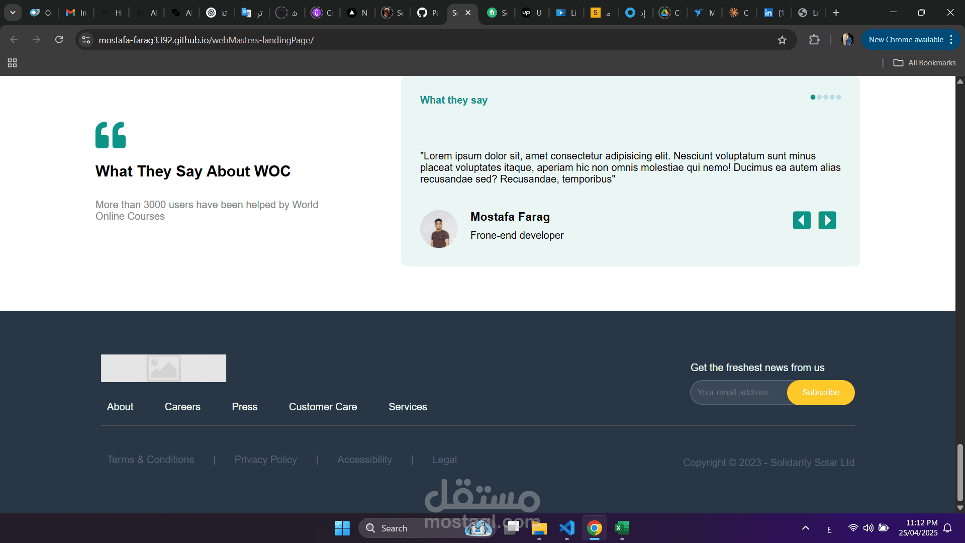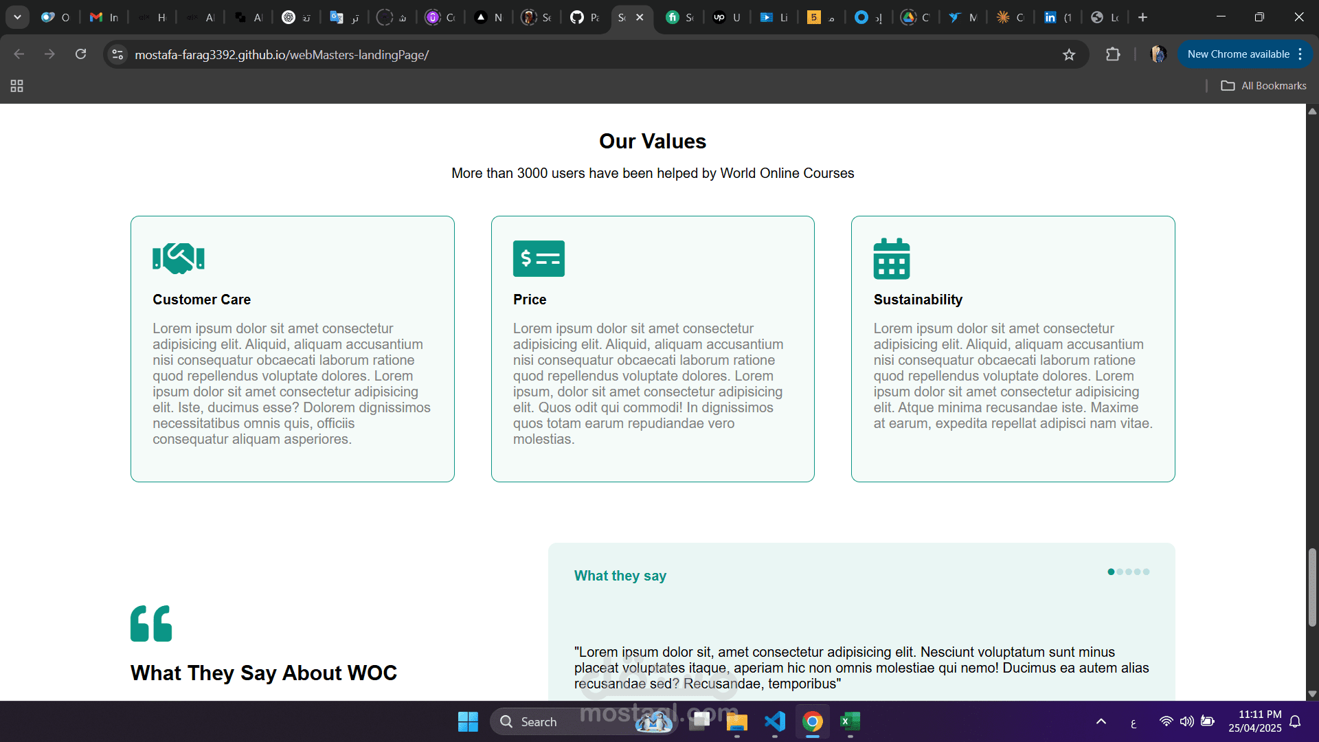 قسم Testimonials لعرض آراء العملاء.