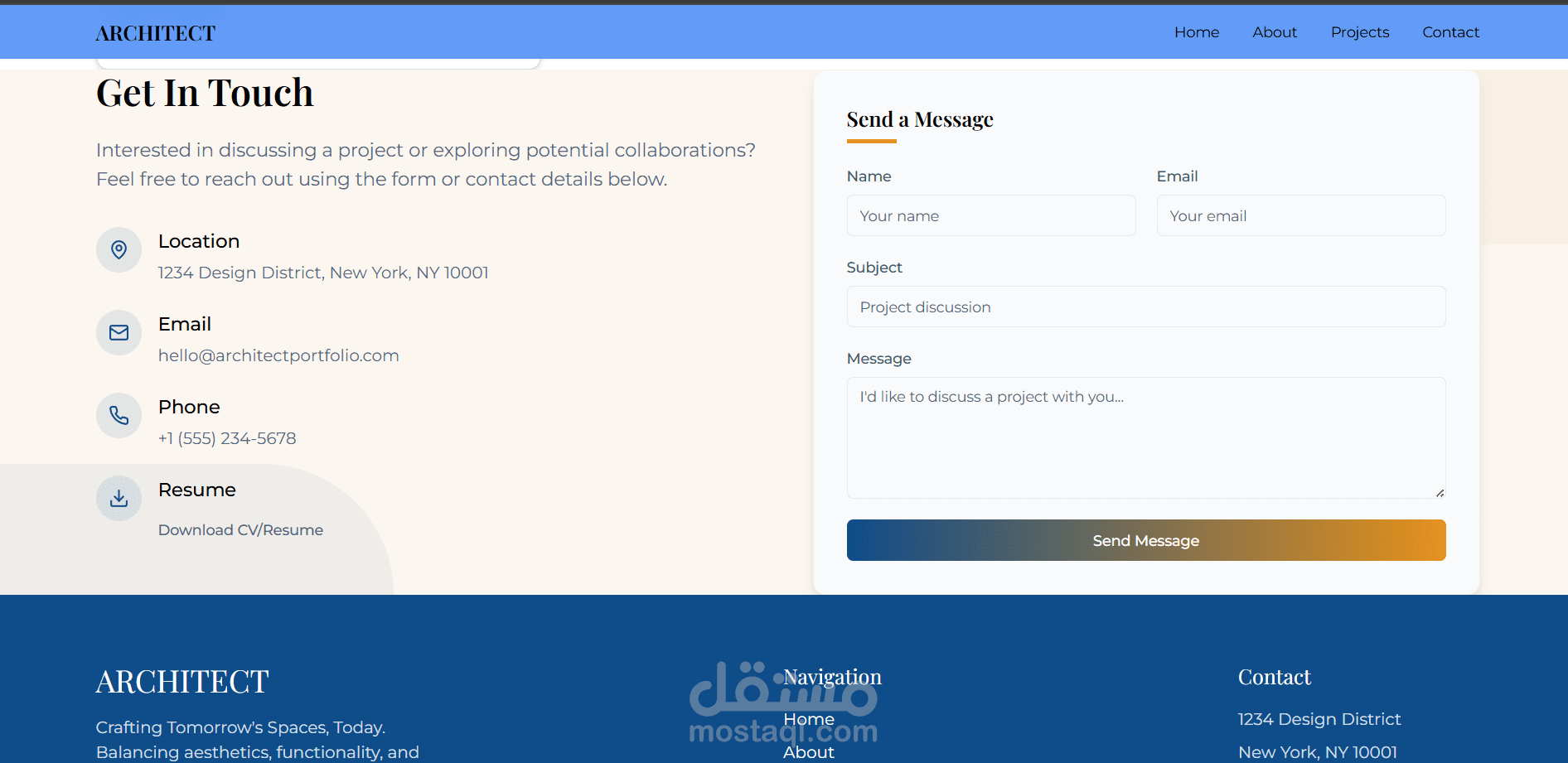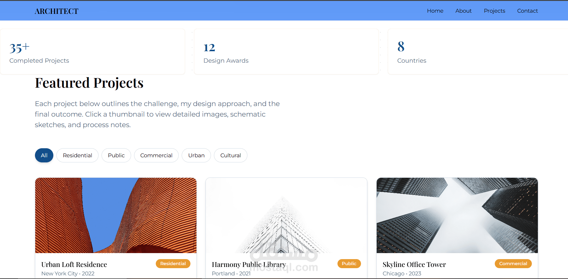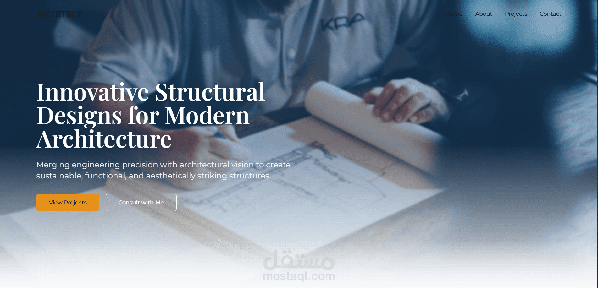 A modern, responsive portfolio website built for architects to showcase their work and expertise. The site features a clean, minimalist design that emphasizes visual content while maintaining professional aesthetics.