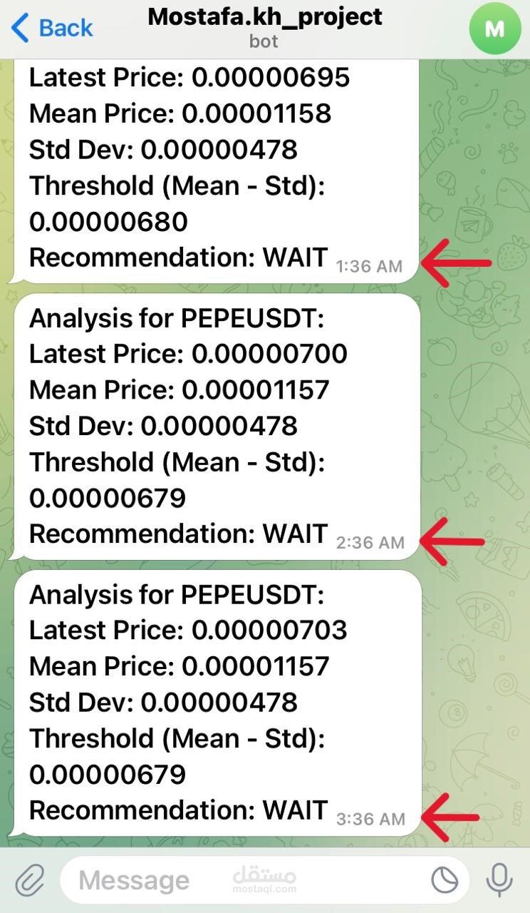 بوت يعتمد على التعلم الآلي (ML) لجلب بيانات سوق العملات الرقمية اللحظية بهدف التنبؤ باتجاهات الأسعار قصيرة الأجل، ثم إرسال تنبيهات للمستخدم عبر تليجرام.