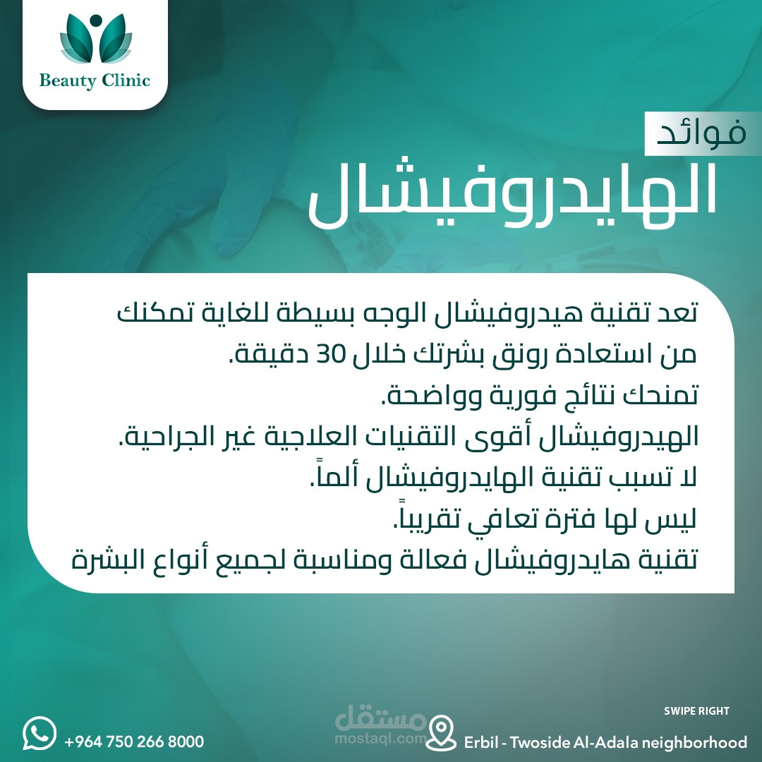 تصميم المنشورات: تم تطوير تصاميم متوازنة بين النصوص التوعوية، العروض الخاصة، وإبراز الخدمات التجميلية المقدمة، مع المحافظة على تناسق بصري واضح بين جميع المنشورات.