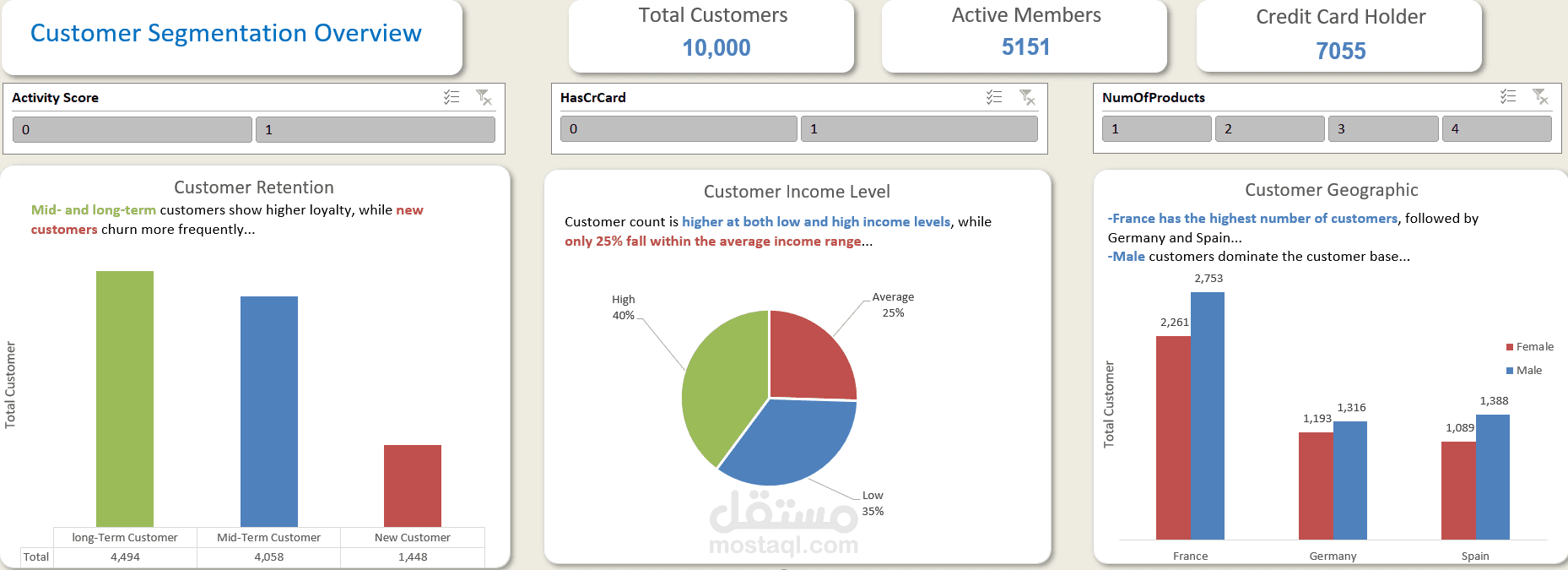 يوفّر هذا المشروع تحليلاً تفصيليًا لسلوك العملاء ومعدلات فقدانهم (Churn) في أحد البنوك الأوروبية. الهدف هو اكتشاف الخصائص المرتبطة بخسارة العملاء، وفهم الخصائص الديموغرافية العامة للعملاء، وتحديد الشرائح المهمة من العملاء من أجل تقديم رؤى تدعم عملية اتخاذ القرار.