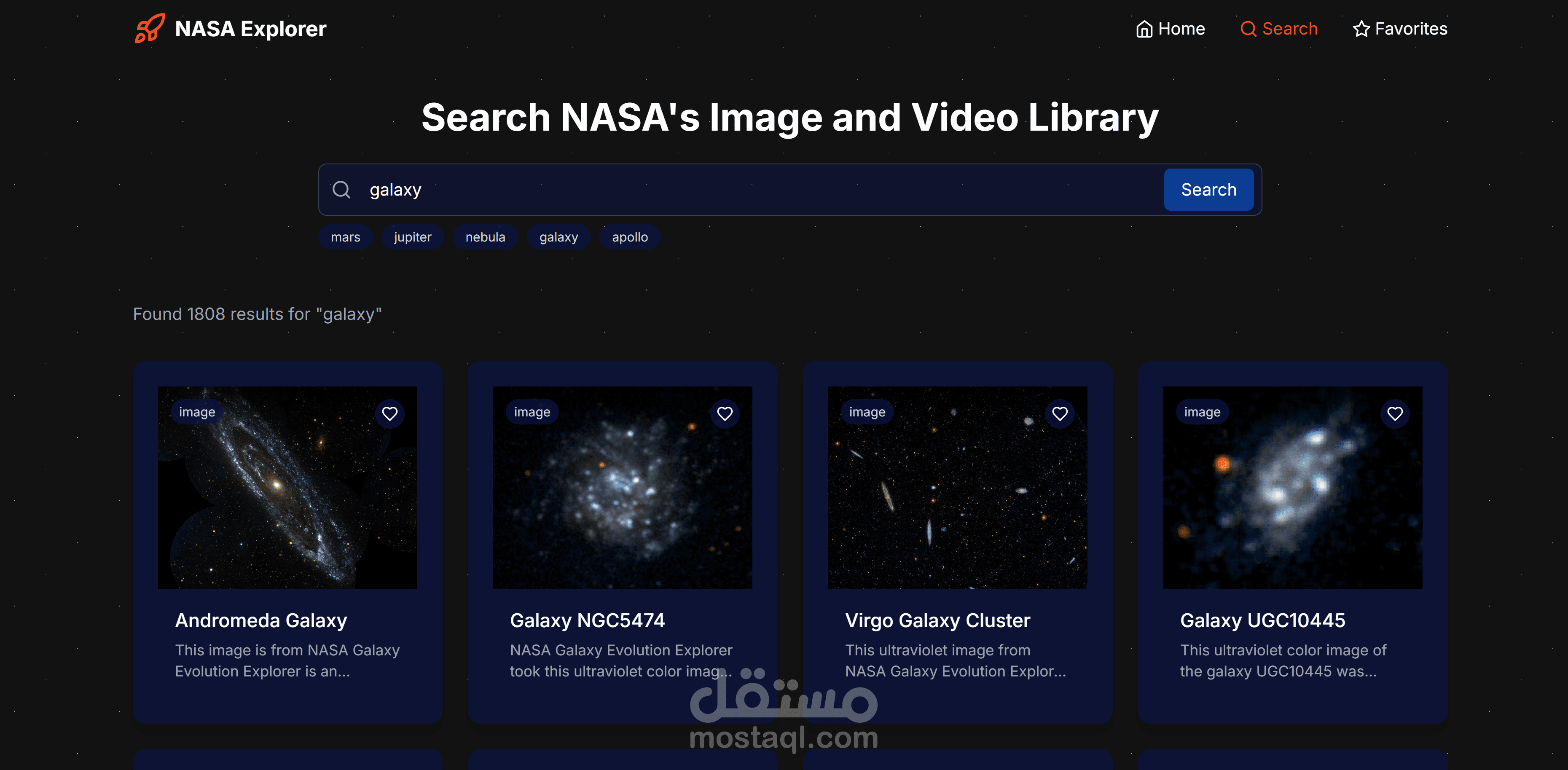 تطبيق web حديث ومتجاوب يوفر تجربة غامرة لاستكشاف مجموعة NASA الواسعة من صور الفضاء والبيانات الفلكية. تم بناؤه باستخدام 18 React و TypeScript، ويقدم هذا التطبيق: