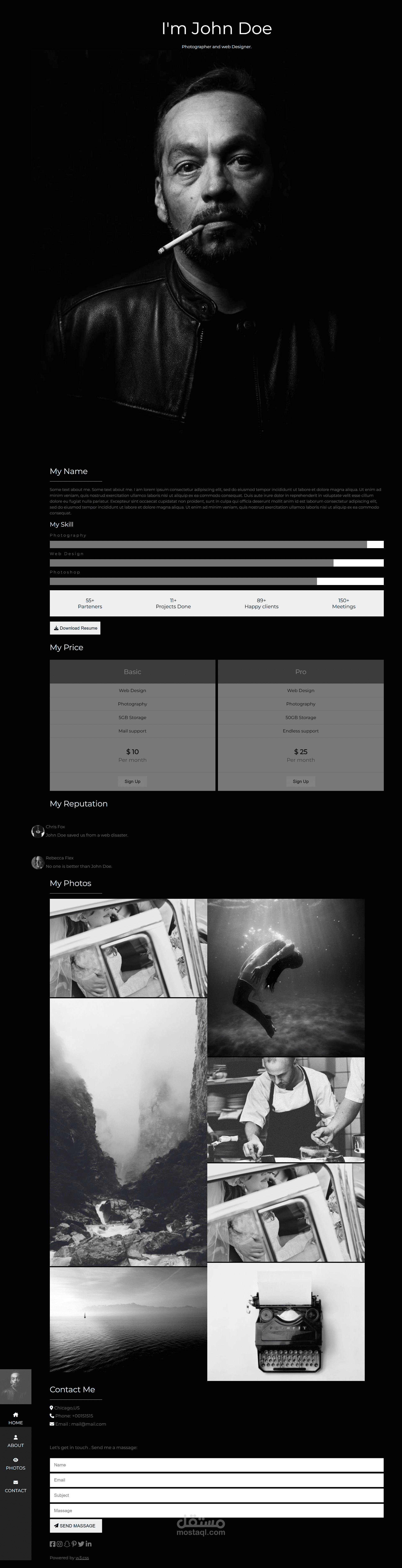 باستخدام HTML , CSS , BOOTSTRAP ، يُبرز هذا المشروع تصميم موقع إلكتروني بورتفوليو شخصي حديث للمصوّر ومصمم الويب "جون دو". يتميز الموقع بتصميم أنيق بخلفية داكنة، مع عرض احترافي للأقسام الرئيسية مثل مقدمة تعريفية، أشرطة تقدم المهارات، خطط الأسعار للخدمات، آراء العملاء، معرض صور ديناميكي، ونموذج تواصل مباشر. يتمتع الموقع بتصفح سلس وقائمة جانبية ثابتة تتيح الوصول السريع إلى جميع الأقسام. كما يتميز بتصميم متجاوب يضمن تجربة مثالية على مختلف الأجهزة. يهدف التصميم إلى إبراز الاحترافية والإبداع وتسهيل التواصل مع العملاء المحتملين.