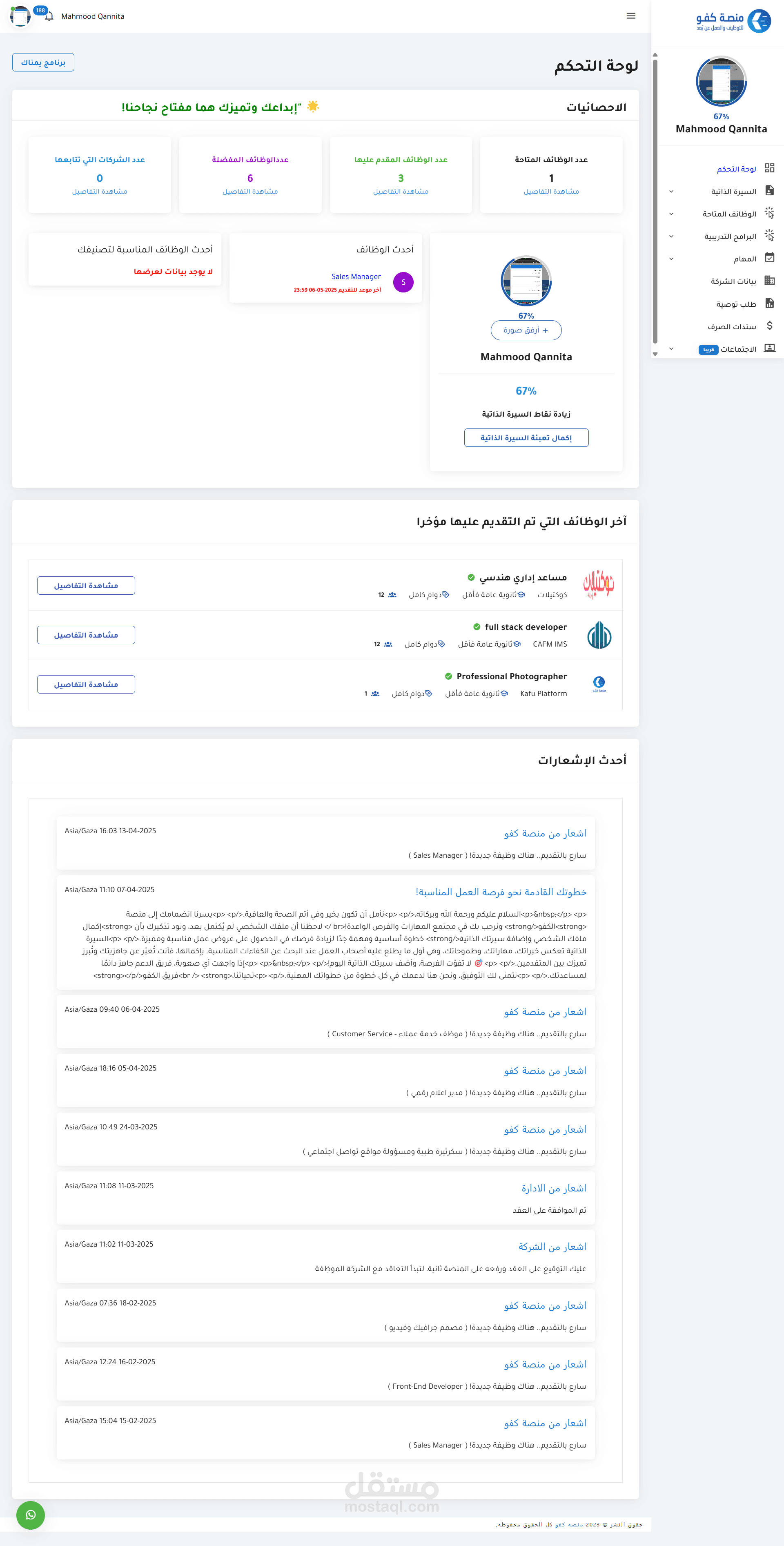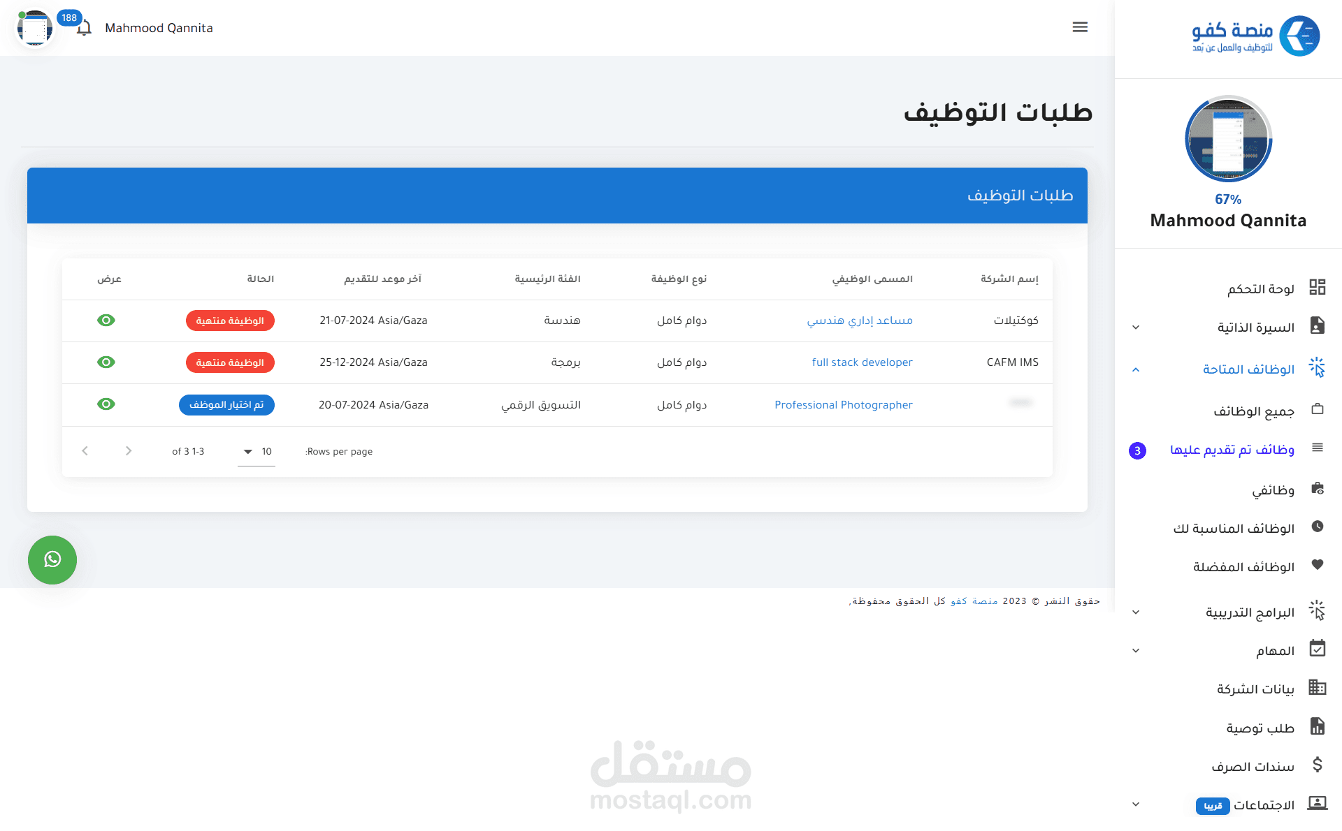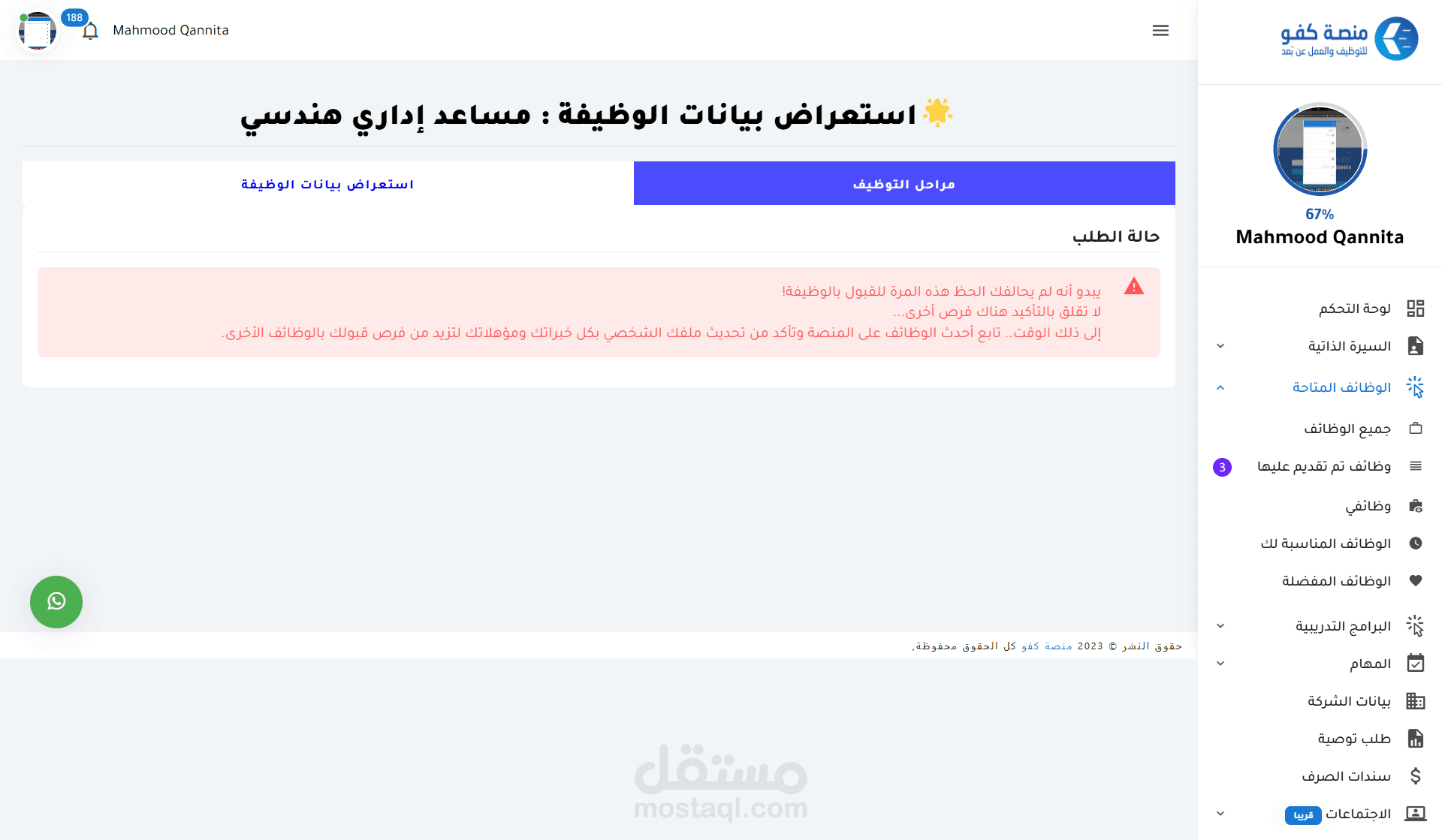 التواصل: يتواصل أصحاب العمل مع المرشحين عبر إشعارات المنصة، أو البريد الإلكتروني، أو واتساب.
