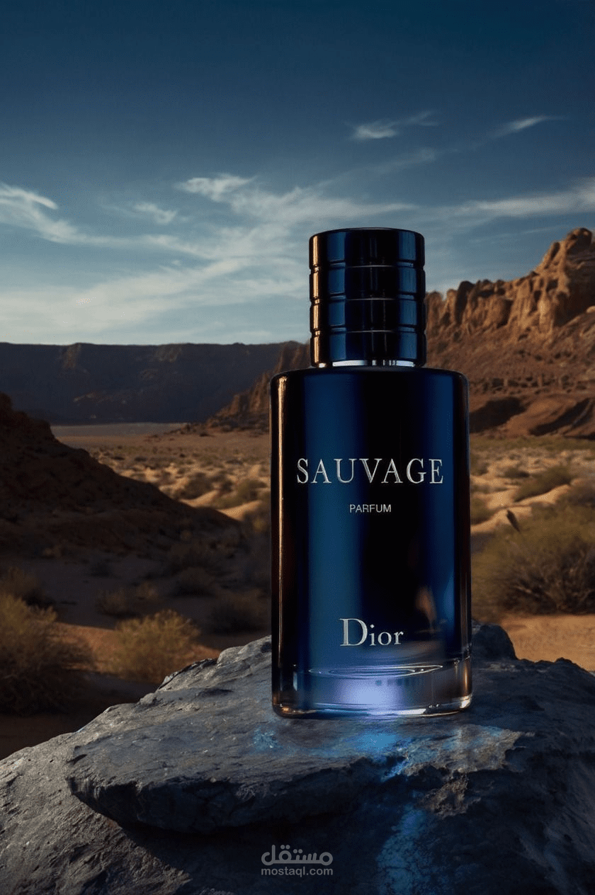 صورة مقربة لزجاجة عطر "Sauvage Parfum" من ديور، موضوعة بشكل بارز على صخرة خشنة ذات لون رمادي داكن. الزجاجة أسطوانية الشكل ذات لون أزرق داكن متدرج يصبح أفتح في الأسفل، مع غطاء أسود مزخرف. يظهر اسم العطر "SAUVAGE" بحروف فضية كبيرة في منتصف الزجاجة، وتحته كلمة "PARFUM" بخط أصغر، وفي الأسفل شعار "Dior" بحروف فضية أنيقة. خلف الزجاجة، تمتد خلفية طبيعية واسعة تظهر تضاريس صحراوية قاحلة بتلال صخرية بنية وجافة تحت سماء زرقاء واسعة تتخللها بعض الغيوم الخفيفة. الإضاءة في الصورة طبيعية وناعمة، تركز على الزجاجة لتبرز تصميمها الأنيق وتناقضها مع البيئة الطبيعية القوية من حولها، مما يوحي برائحة العطر المستوحاة من البرية.
