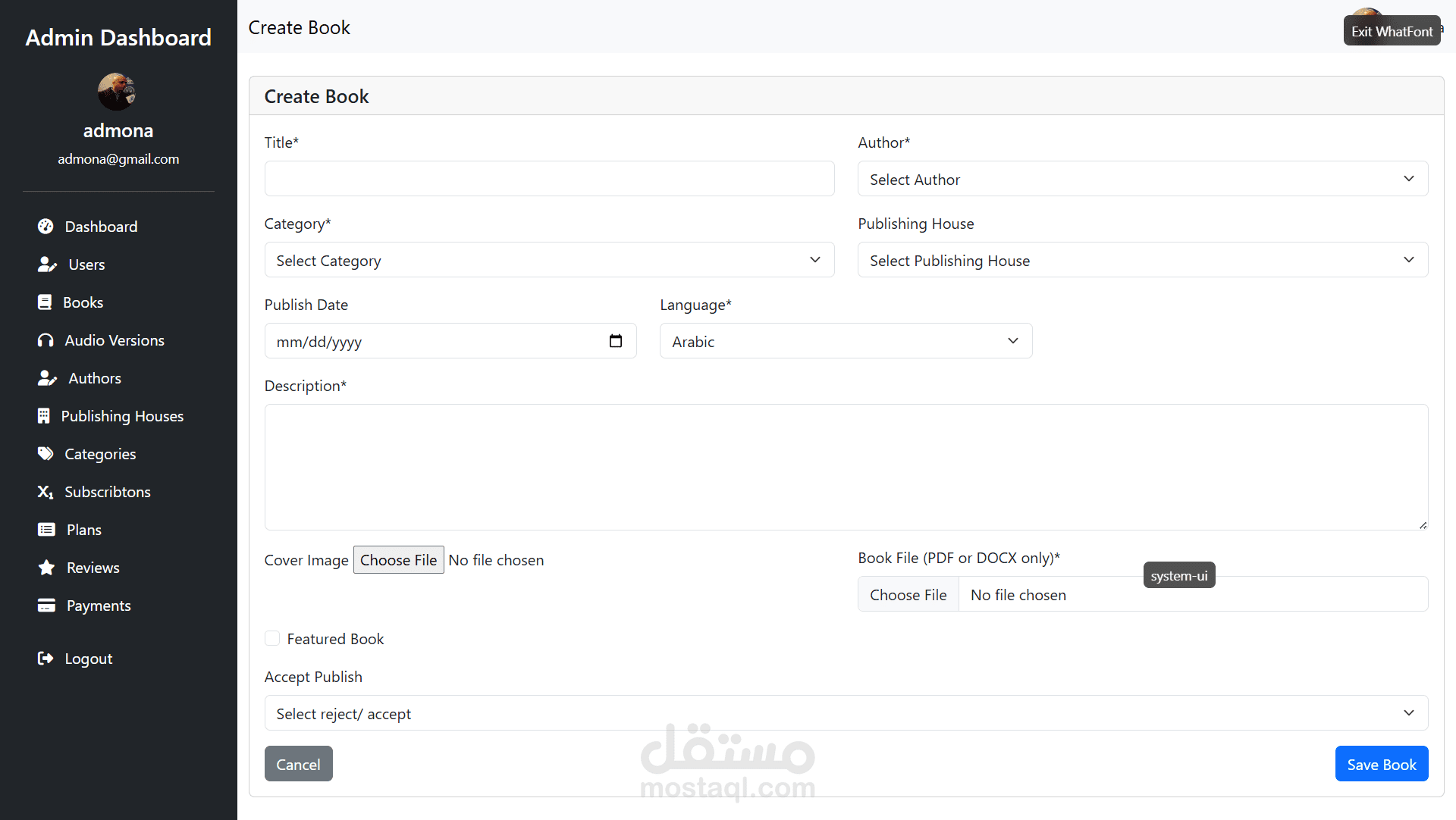 - يضيف قائمة كتب، مؤلف، دور نشر، مستخدم (ناشر، راوى، ادمن)، خطط للاشتراك،