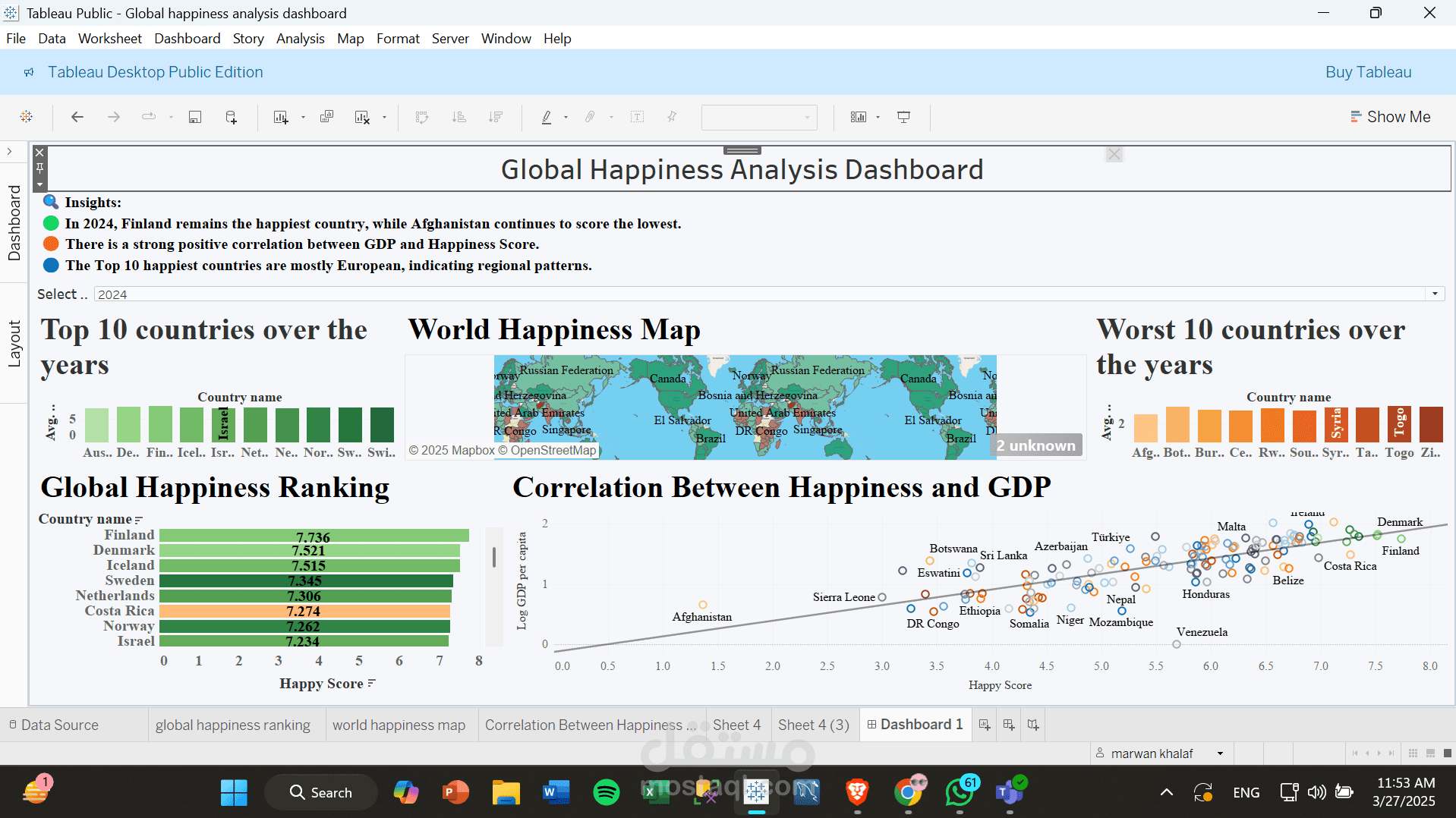 قمت بتصميم لوحة معلومات تفاعلية باستخدام برنامج Tableau لتحليل بيانات تقرير السعادة العالمي لعام 2024.