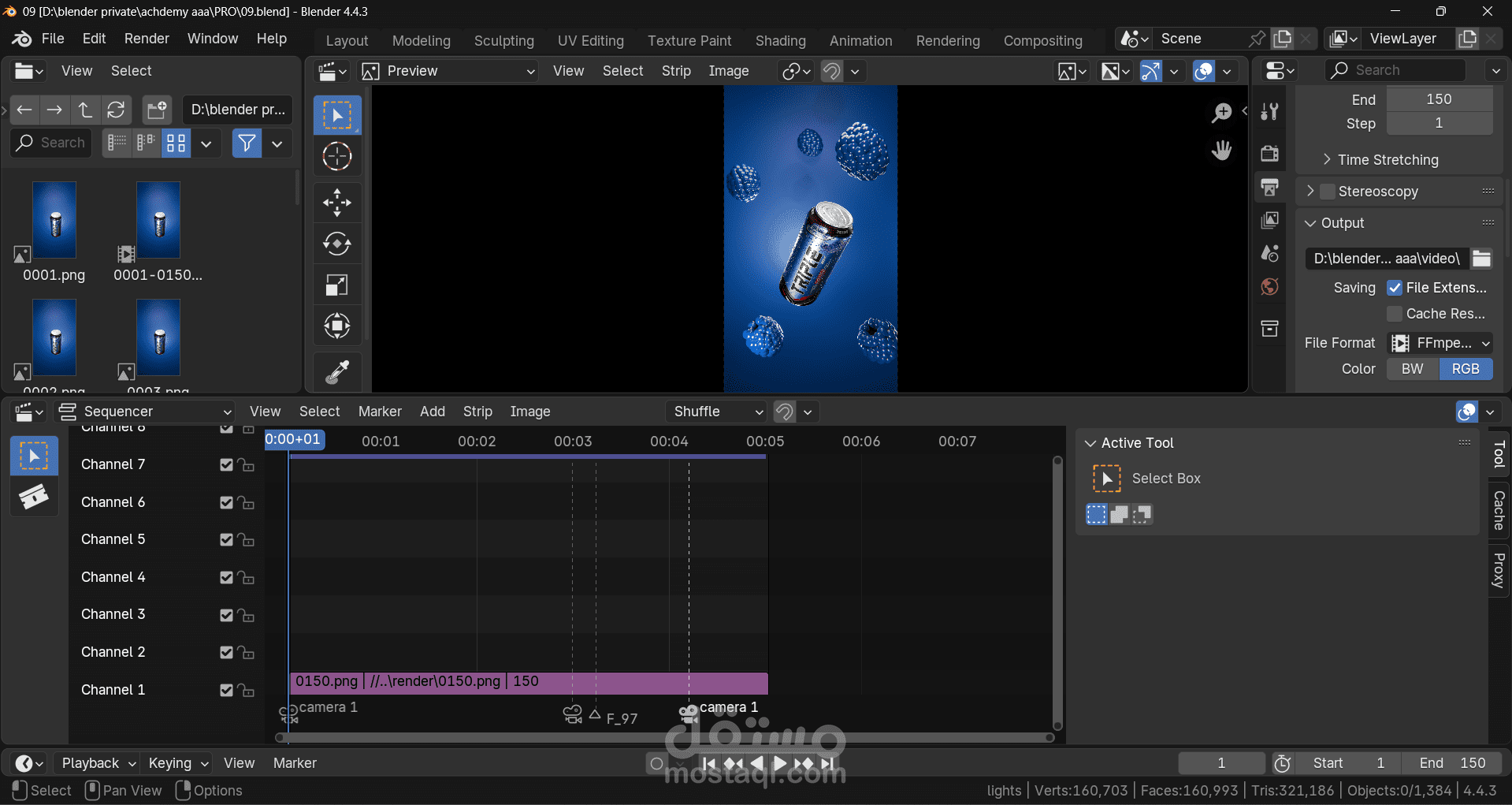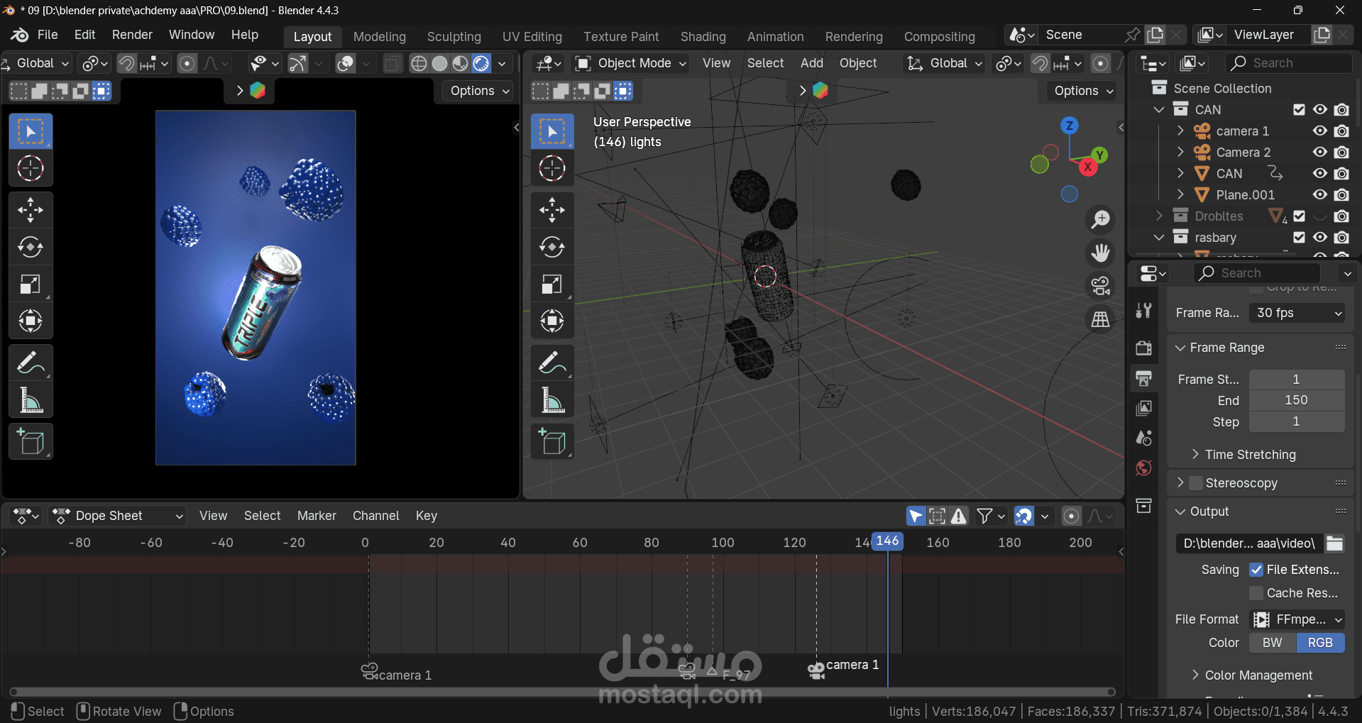 لتصميم إعلان (علبة مشروب) 3D باستخدام Blender 4.4 مع محرك Cycles، وتم تعزيز الإخراج بإضاءة واقعية وتوزيع عناصر (فاكهة وتفاصيل طافية) لدعم الجانب التسويقي.
