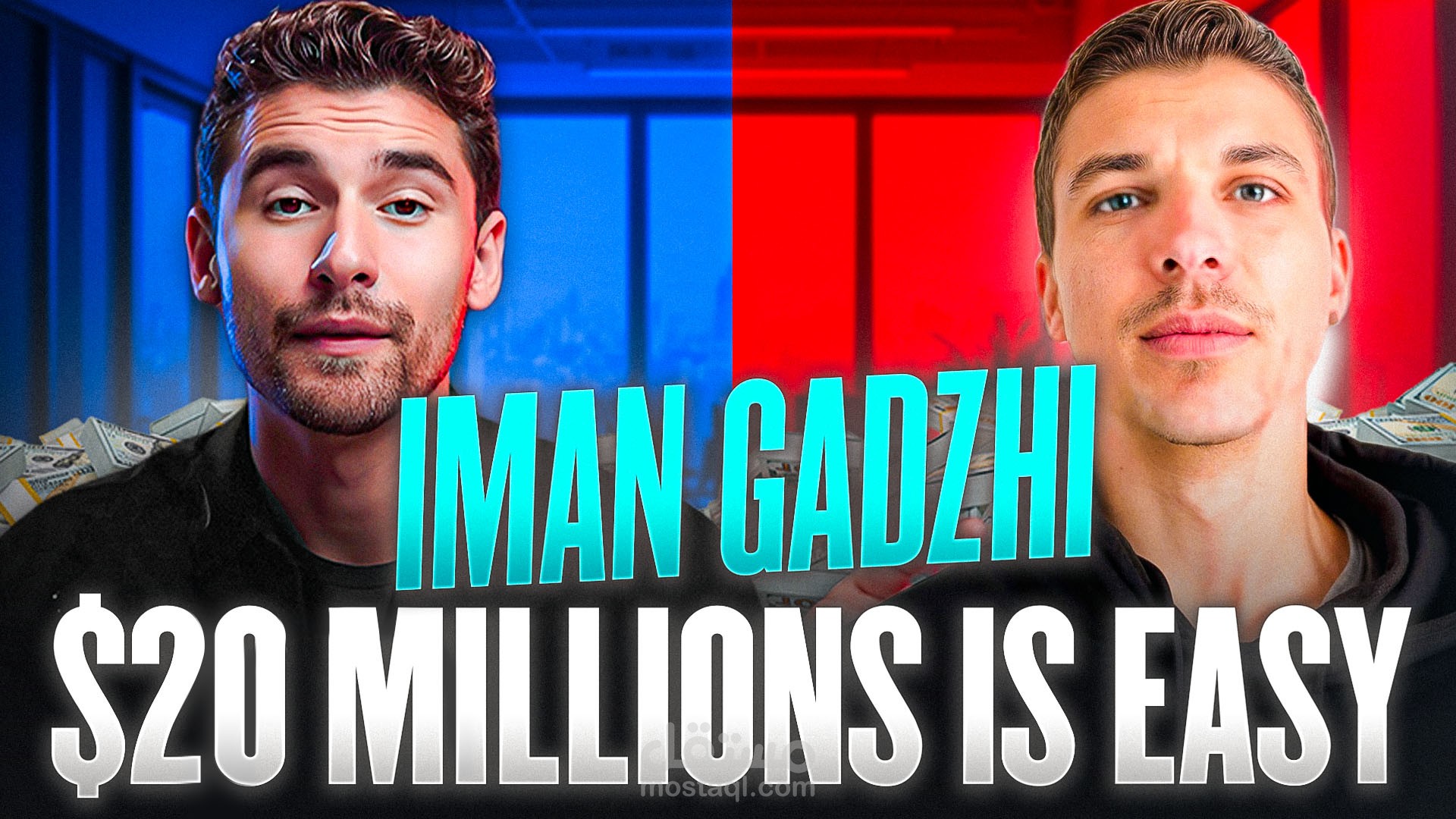 الصورة توحي بأن محتوى الفيديو يتحدث عن كيفية تحقيق ثروة كبيرة بسهولة، ربما من خلال مقابلة أو شرح من إيمان غادجي، المعروف بمجال ريادة الأعمال والتسويق الرقمي. الخلفيات المتباينة (أحمر وأزرق) تعطي إحساسًا بالمقارنة أو التحدي بين الشخصين في الصورة.