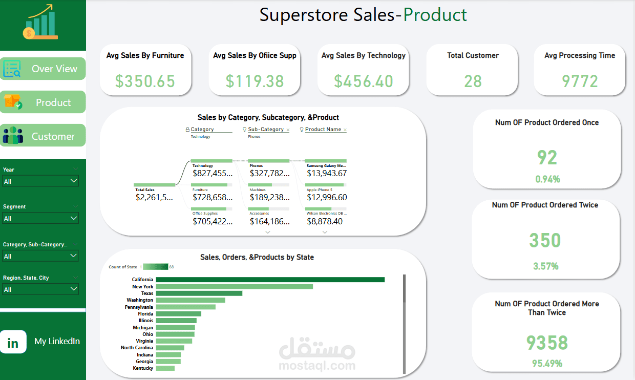 يتضمن هذا المشروع لوحة معلومات شاملة لتحليل المبيعات تم تطويرها باستخدام Power BI اعتمادًا على مجموعة بيانات Superstore الشهيرة. تنقسم اللوحة إلى ثلاثة أقسام رئيسية—الصفحة العامة، صفحة المنتجات، وصفحة العملاء—وكل منها يقدم رؤى قابلة للتنفيذ لمتخذي القرار في الأعمال.