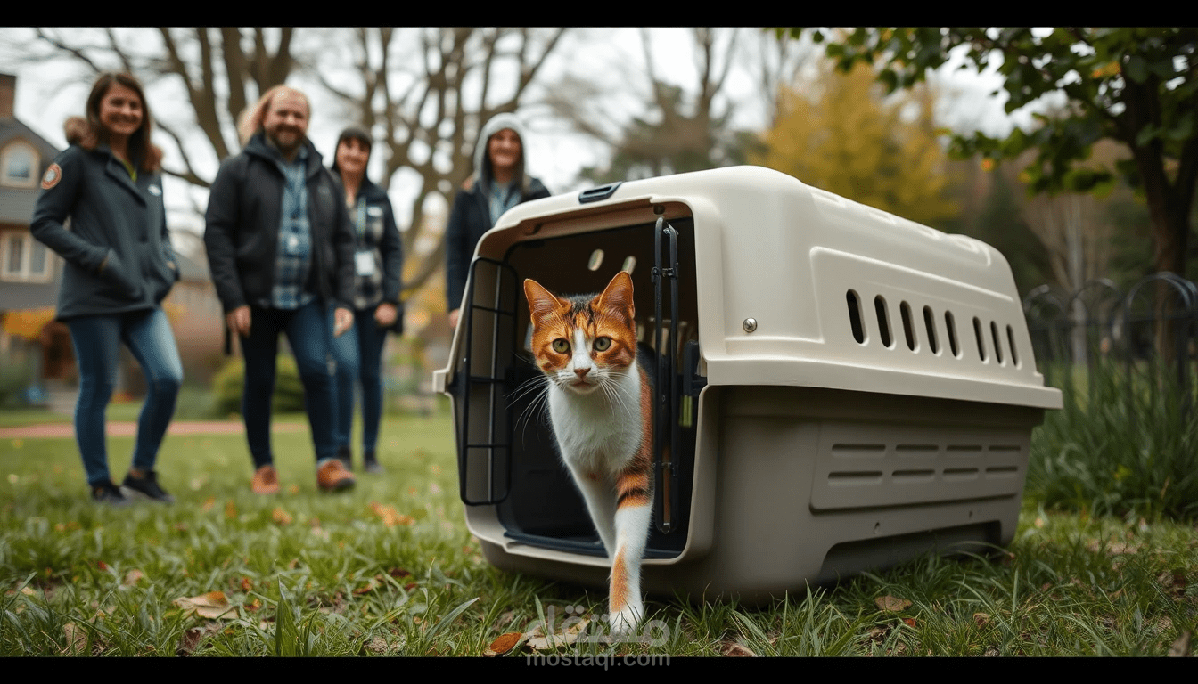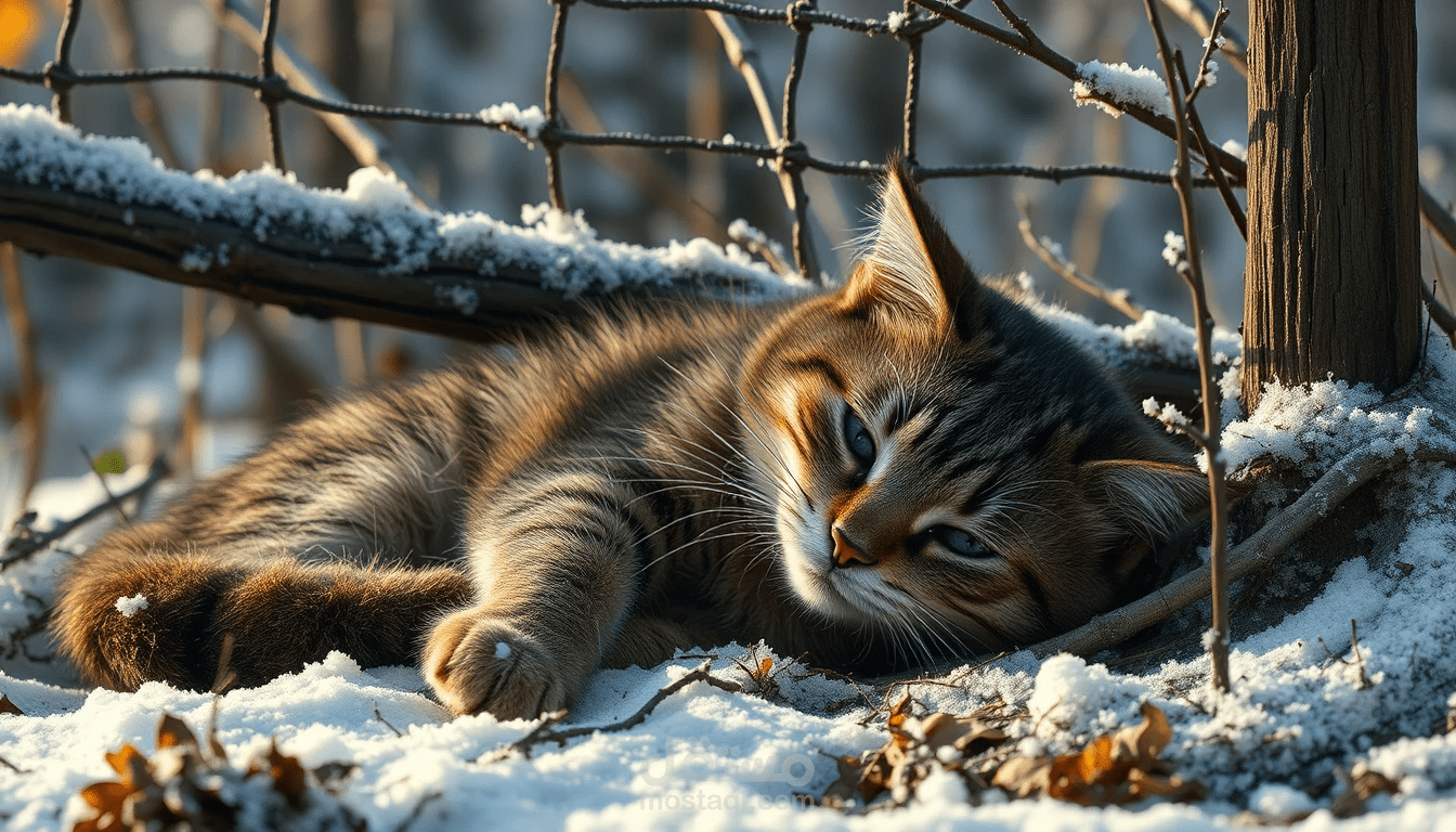 الصورة تظهر قطة سوداء ذات فرو ناعم وعيون زرقاء ساحرة وهي تجلس على نافذة واسعة تطل على مشهد طبيعي خلاب، مع شمس مشرقة تنساب من خلفها.