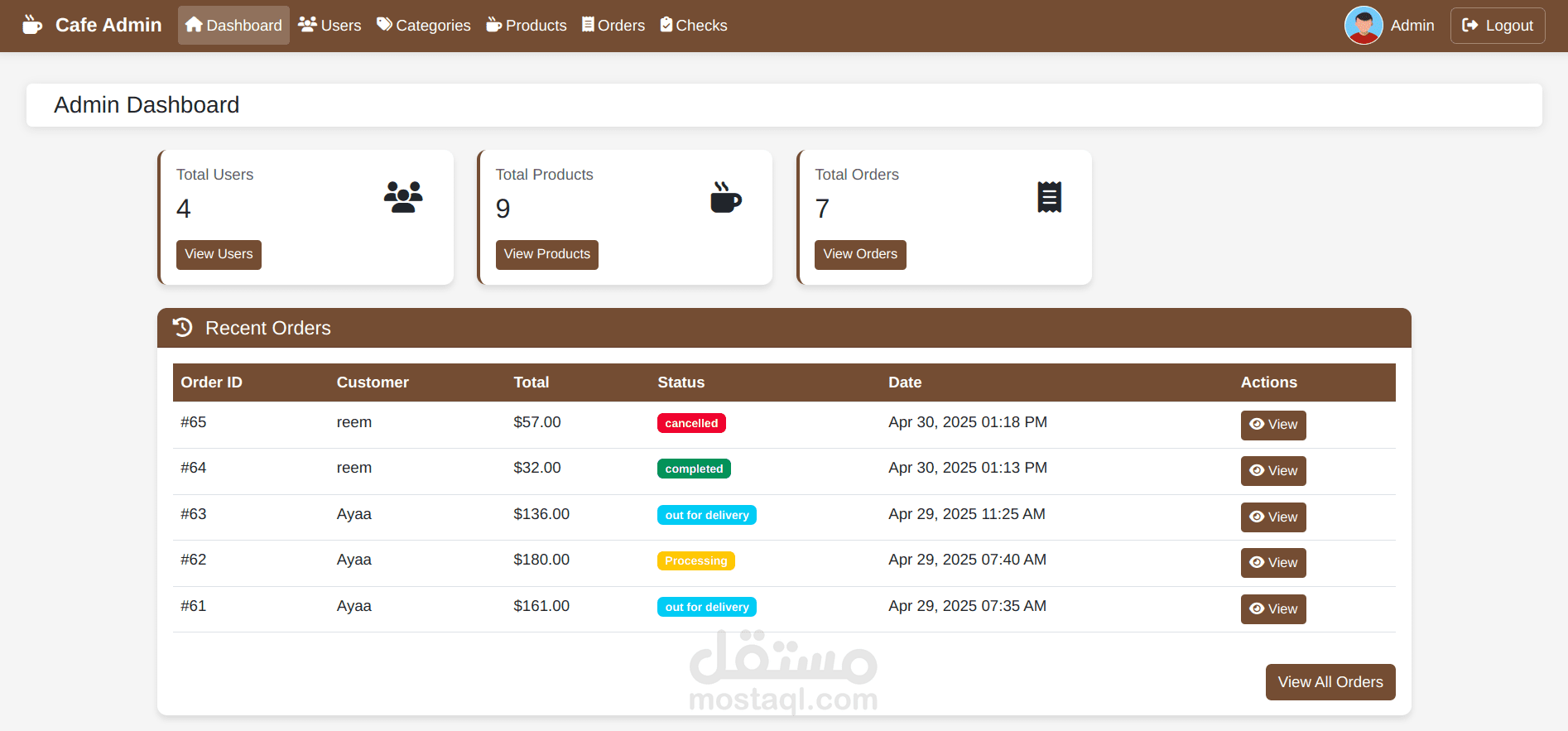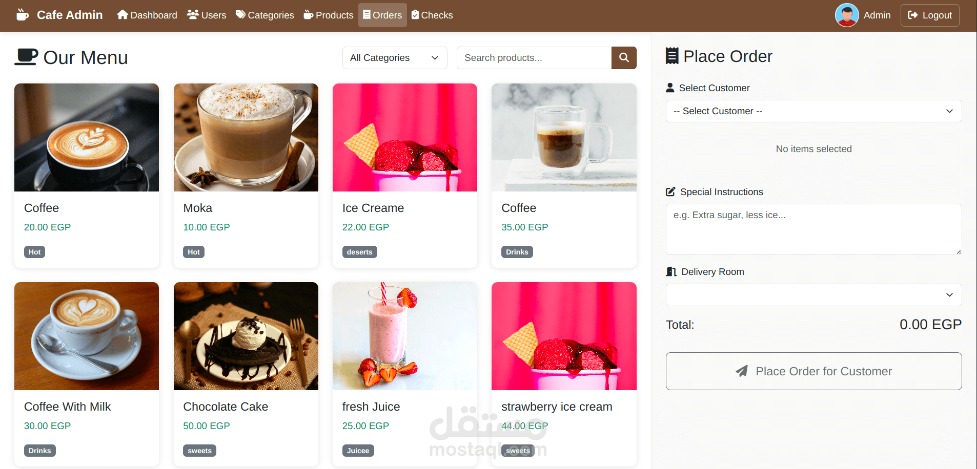 نظام الكافيتريا هو تطبيق ويب بسيط ومتكامل يهدف إلى تسهيل عملية إدارة الطلبات والمنتجات داخل الكافيتريا، ويحتوي على واجهتين رئيسيتين:
