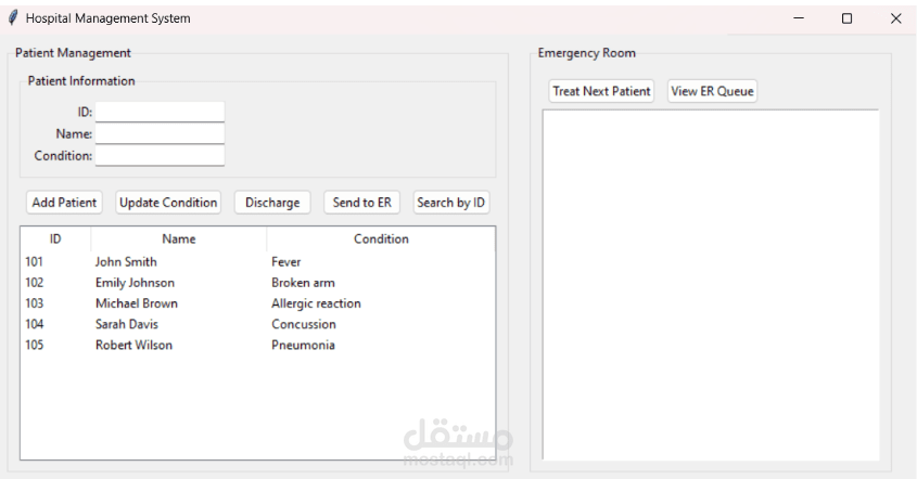 واجهة الاستخدام تم تصميمها بـ Tkinter بشكل مستقل، وتوفر وظائف مثل إضافة المرضى، عرض الحالات، وإدارة طوارئ المستشفى بطريقة سهلة وتفاعلية.