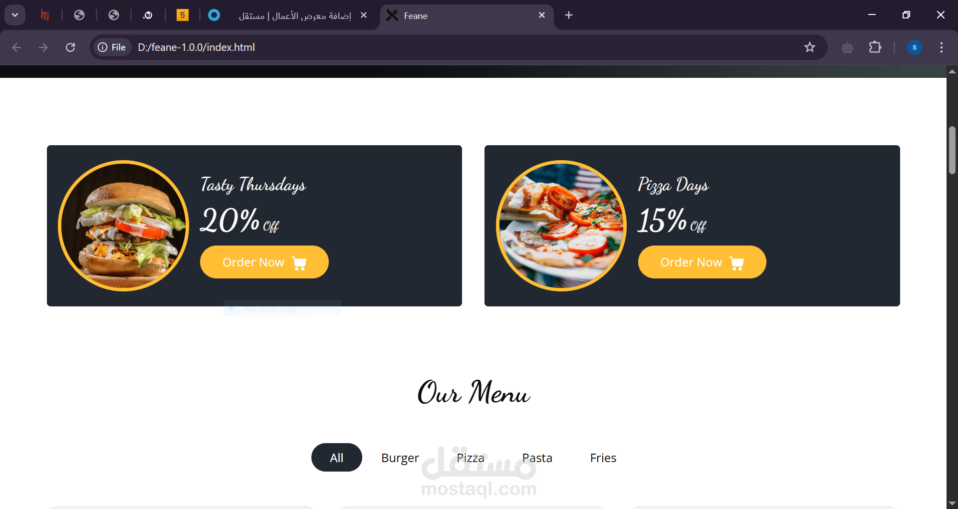 قمت بتصميم وتطوير واجهة مستخدم لموقع Feane، وهو موقع عصري لمطعم متخصص في الوجبات السريعة. يتميز الموقع بتصميم جذاب وألوان متناسقة تبرز منتجات الطعام بشكل جذاب، مع صور عالية الجودة لعناصر القائمة. يتيح الموقع للمستخدمين تصفح القائمة، حجز طاولة، أو تقديم طلب أونلاين بكل سهولة.