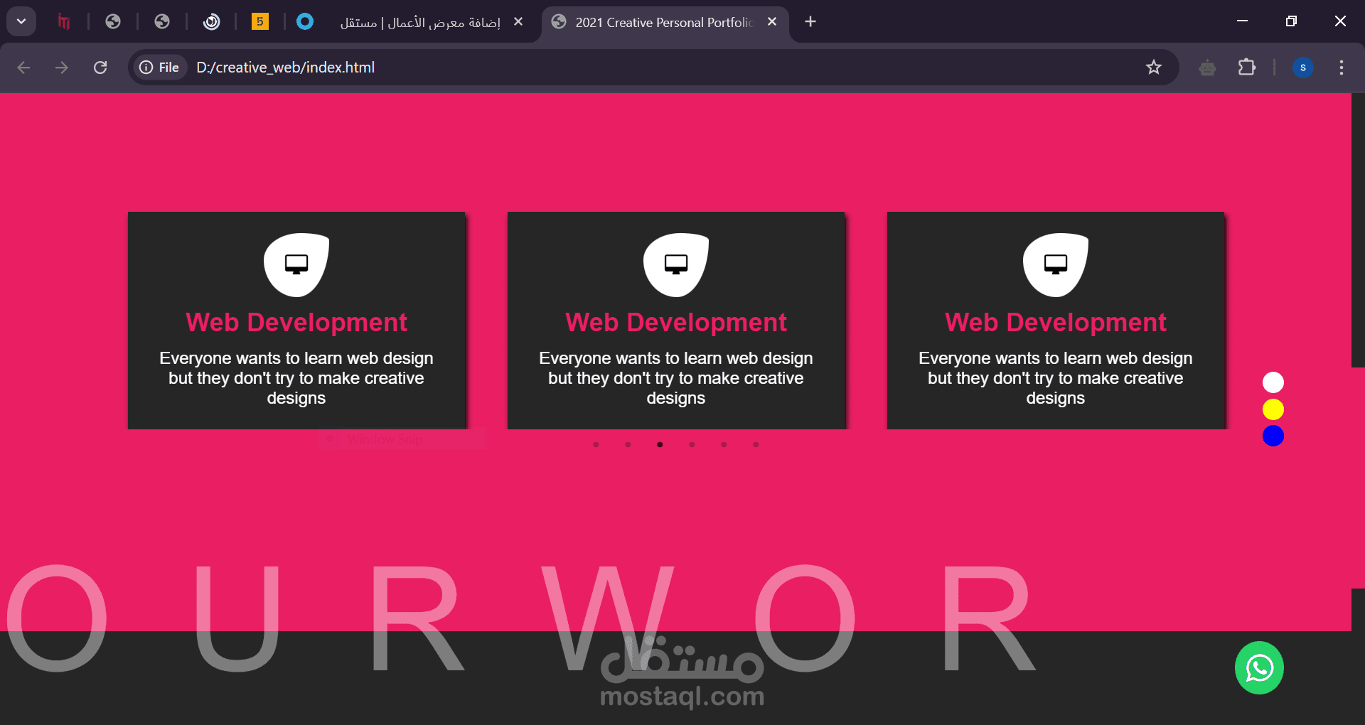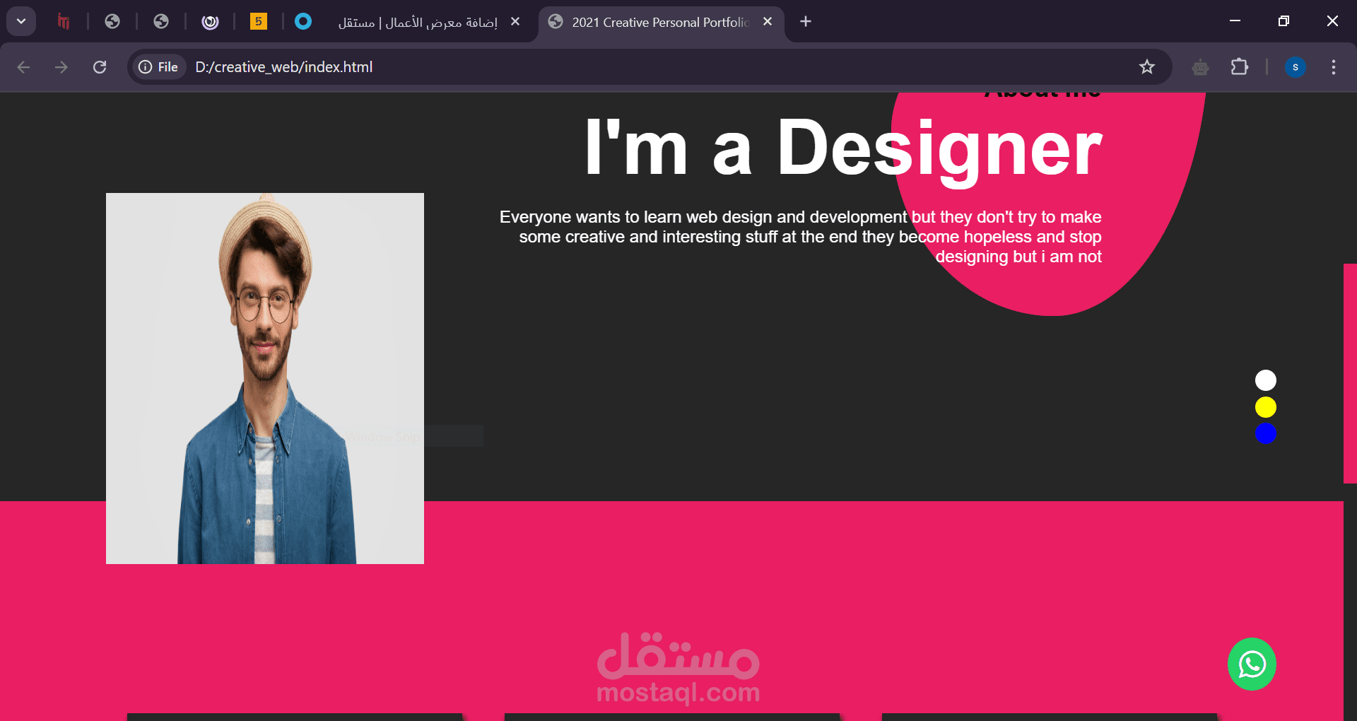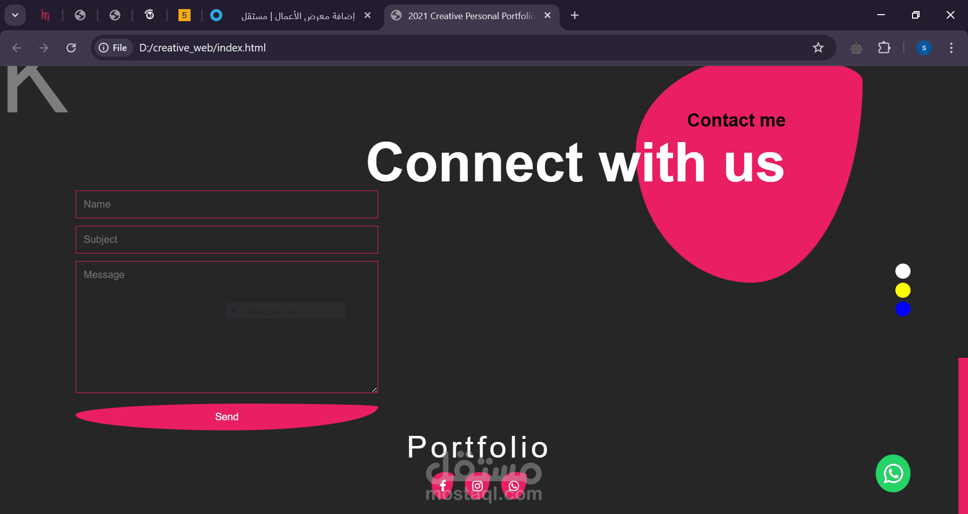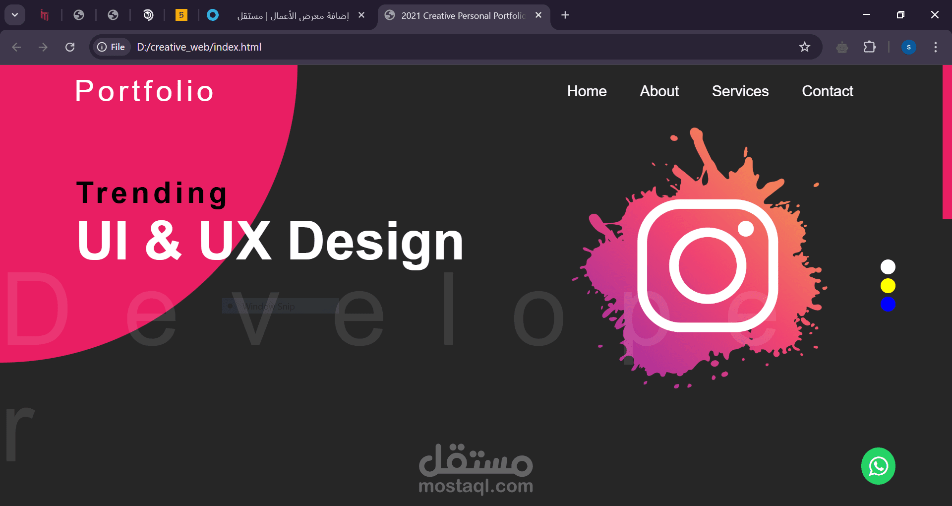 الواجهة تحتوي على قائمة تنقل بسيطة (Home, About, Services, Contact) بالإضافة إلى تفاعل بصري جذاب، مثل تغيير ألوان الخلفية وتكامل أيقونات وسائل التواصل الاجتماعي مثل إنستغرام وواتساب.
