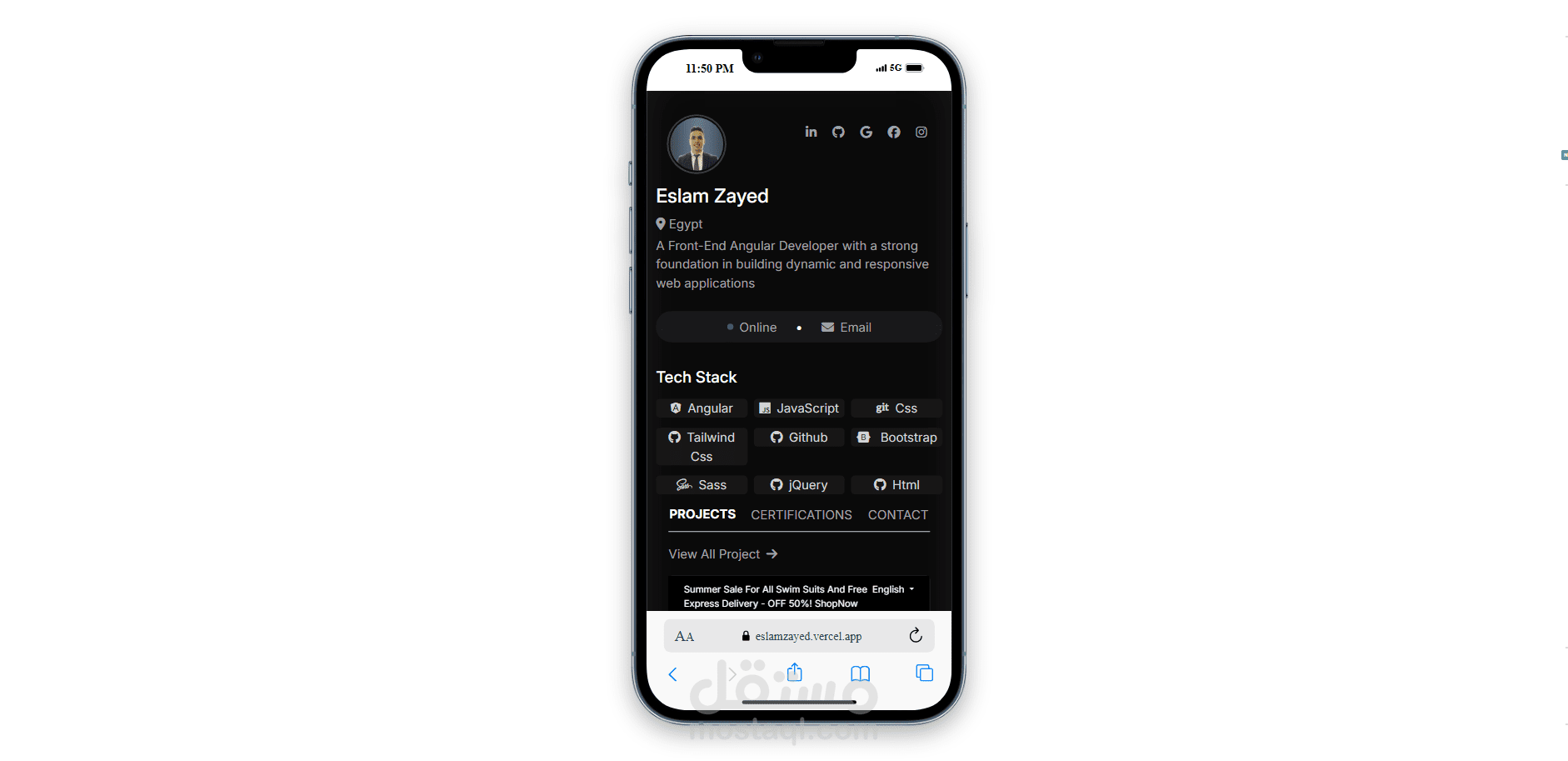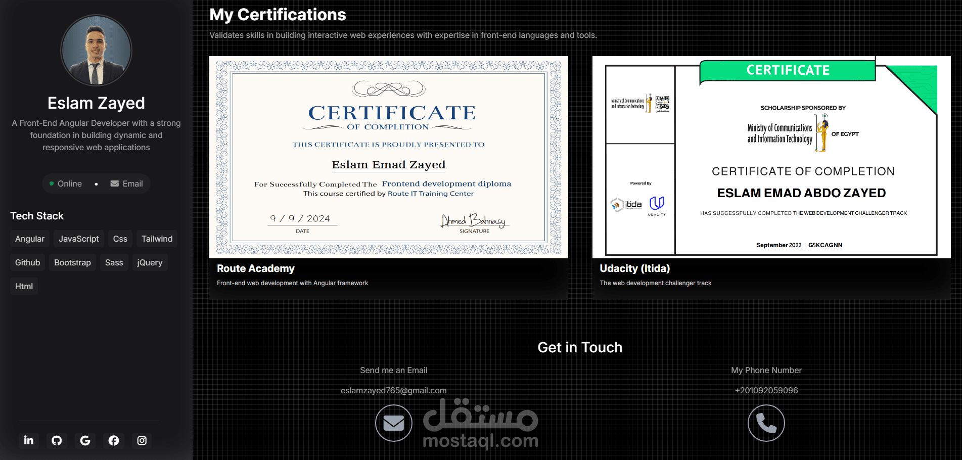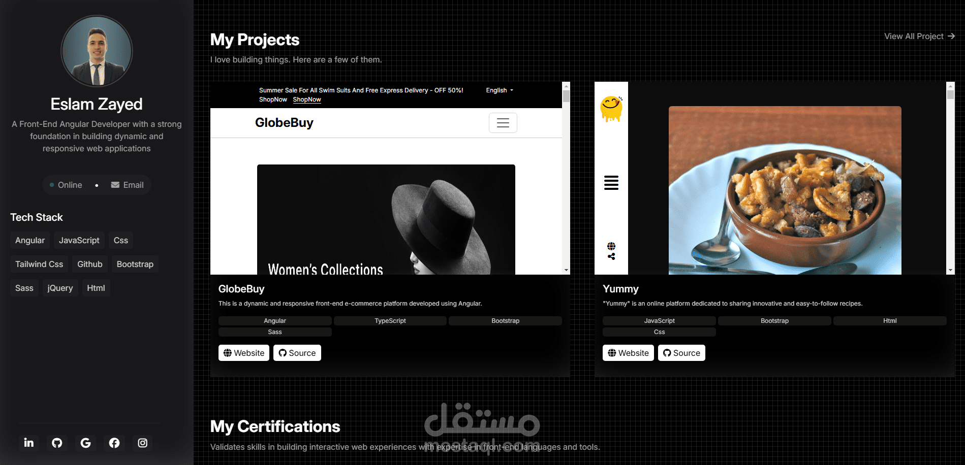 موقع بورتفوليو احترافي مصمم لعرض مهارات ومشاريع المطور بشكل أنيق وتفاعلي. تم بناء الواجهة باستخدام Angular مع دمج تصميم داكن أنيق يعرض المعلومات الشخصية، المهارات التقنية (Tech Stack)، وروابط التواصل الاجتماعي، بالإضافة إلى عرض منسق للمشاريع السابقة والأعمال المنجزة.