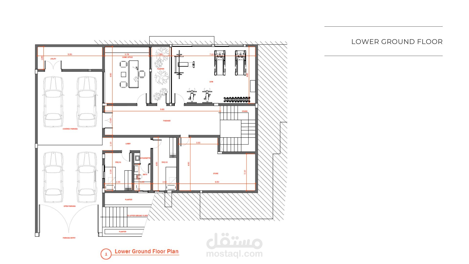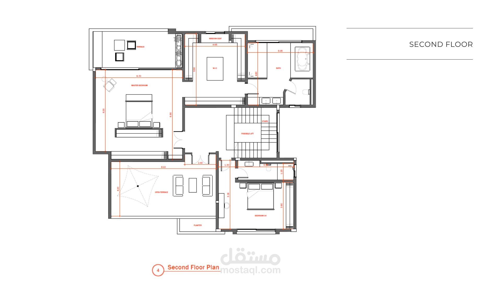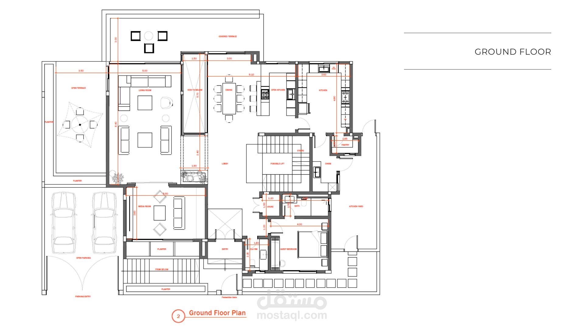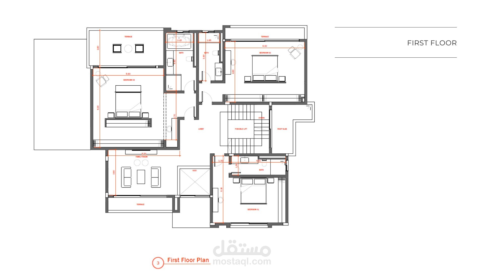 يعرض هذا المخطط المعماري ثنائي الأبعاد تصميم فيلا يتميز بالراحة والوظيفية. يشمل المخطط مساحات محددة بوضوح مثل المدخل الرئيسي، مناطق المعيشة والطعام، المطبخ، الحمامات، وعدة غرف نوم. يراعي التصميم سهولة الحركة داخل الفراغات، والإضاءة الطبيعية، والتوزيع المتوازن بين المناطق الخاصة والمشتركة.
