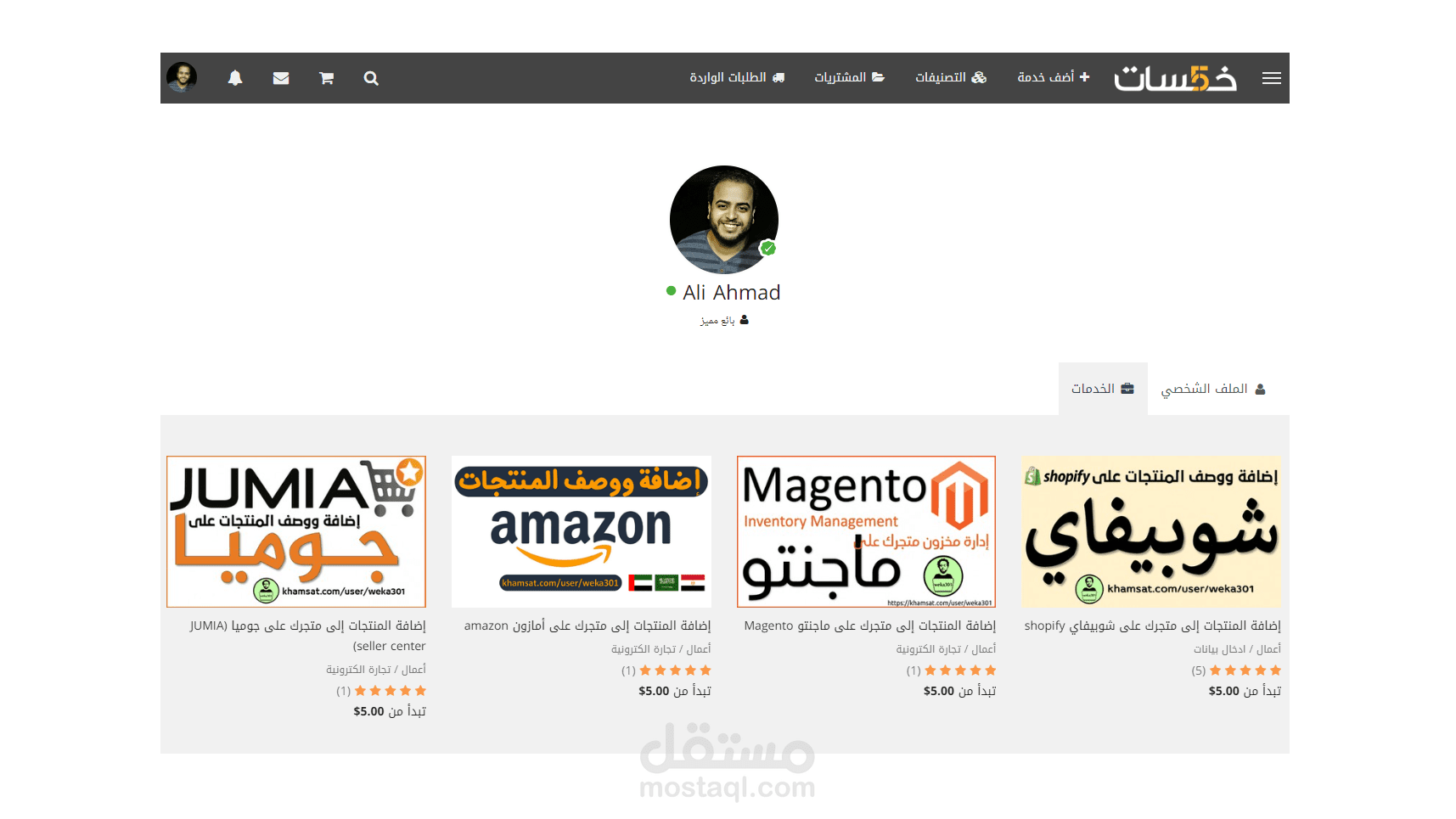 إليكم صور من حسابي لخدماتي على خمسات، وهي خاصة بالتجارة الإلكترونية على المنصات المختلفة.