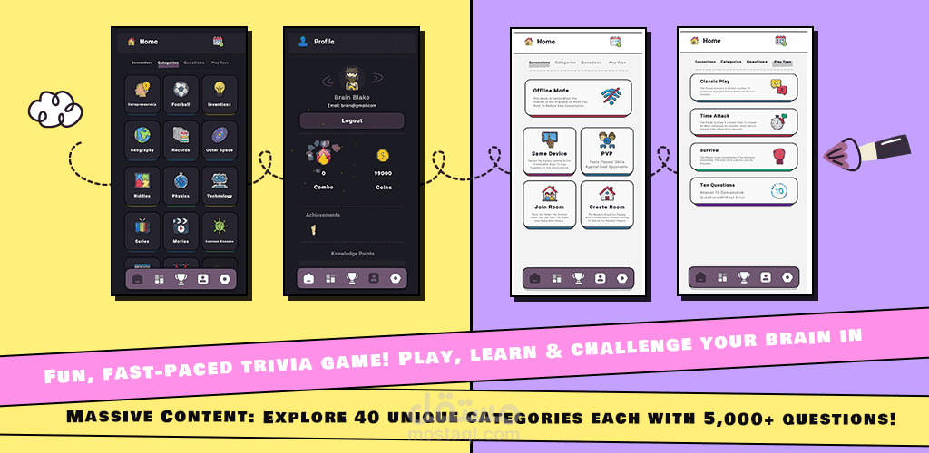 Endless Replay Value. With over 200,000 questions across 40 diverse topics—from science, history, and geography to sports, pop culture, logic, and beyond—you’ll never run out of new challenges.